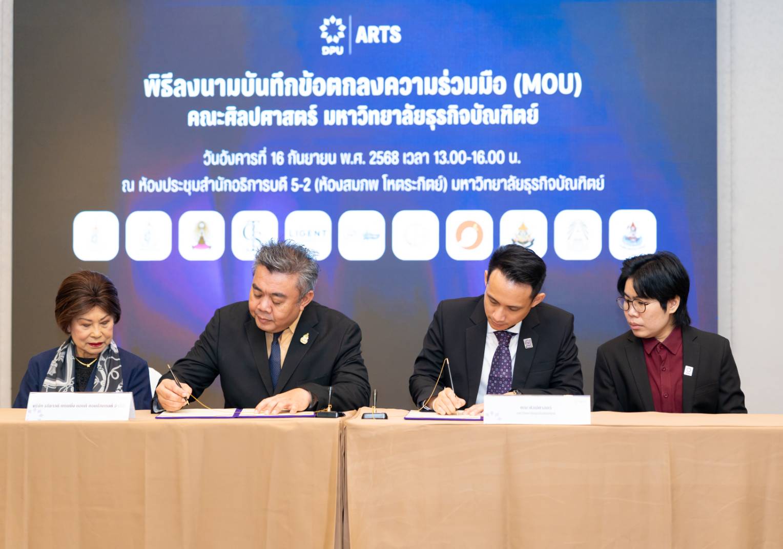 เมื่อวันที่ 16 กันยายน 2568 คณะศิลปศาสตร์ มหาวิทยาลัยธุรกิจบัณฑิตย์ (DPU) นำโดย ดร.วริศ ลิ้มลาวัลย์ คณบดีคณะศิลปศาสตร์ จัดพิธีลงนามบันทึกข้อตกลงความร่วมมือทางวิชาการ (MOU) ร่วมกับสถานประกอบการและสถานศึกษาจำนวน 11 แห่ง เพื่อผลิตบัณฑิตคุณภาพที่พร้อมก้าวสู่โลกการทำงานจริง ตอบโจทย์ตลาดแรงงานยุคใหม่ และยกระดับมาตรฐานการศึกษาไทยให้ทันต่อการเปลี่ยนแปลงในศตวรรษที่ 21 โดยมีคณาจารย์ ผู้แทนสถานประกอบการ และสถานศึกษาเข้าร่วมอย่างคับคั่ง