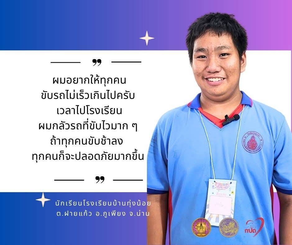 “ผมอยากให้ทุกคนขับรถไม่เร็วเกินไปครับ เวลาไปโรงเรียนผมกลัวรถที่ขับไวมาก ๆ ถ้าทุกคนขับช้าลง ทุกคนก็จะปลอดภัยมากขึ้น”