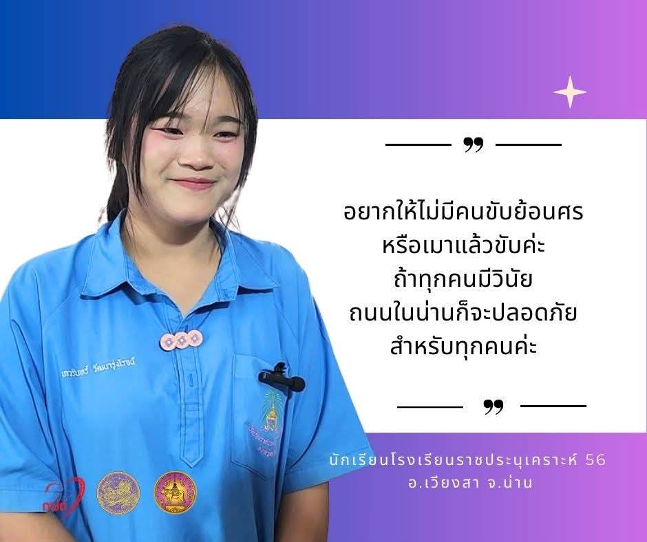 “อยากให้ไม่มีคนขับย้อนศร หรือเมาแล้วขับ ถ้าทุกคนมีวินัย ถนนในน่านก็จะปลอดภัยสำหรับทุกคน”