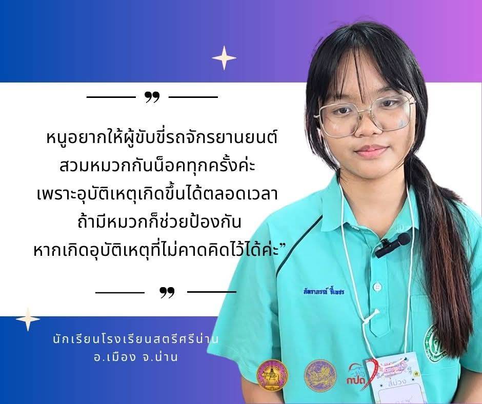 “หนูอยากให้ผู้ขับขี่สวมหมวกกันน็อกทุกครั้งค่ะ เพราะอุบัติเหตุเกิดขึ้นได้ตลอดเวลา ถ้ามีหมวกก็ช่วยป้องกันอันตรายได้”