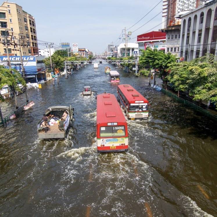 องค์การเพื่อความร่วมมือและการพัฒนาทางเศรษฐกิจ (OECD) ระบุว่า ตั้งแต่ปี พ.ศ. 2563 เป็นต้นไปประชากร 5 ล้านคนจาก 10.7 ล้านคนในกรุงเทพ มหานครอาจเผชิญกับความเสี่ยงจากน้ำท่วมโดยคาดว่าพื้นที่หนึ่งในสามของเมืองหลวงของไทยอาจจมอยู่ใต้น้ำทั้งหมดภายใน พ.ศ. 2593 และส่งผลให้ประชาชนเกือบ 11 ล้านคนต้องอพยพออกจากพื้นที่