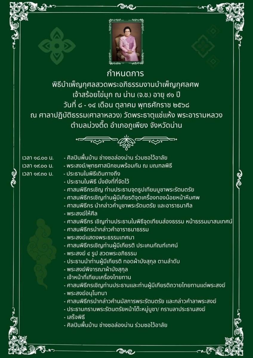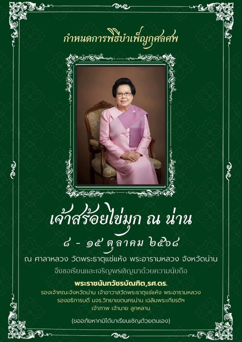 วันที่ 8 ตุลาคม 2568 ณ ศาลาหลวง วัดพระธาตุแช่แห้ง พระอารามหลวง อำเภอภูเพียง จังหวัดน่าน ได้ประกอบพิธีพระราชทานน้ำหลวงอาบศพ และพิธีบำเพ็ญกุศลศพ “เจ้าสร้อยไข่มุก ณ น่าน” อายุ 91 ปี มารดา พระราชนันทวัชรบัณฑิต รองเจ้าคณะจังหวัดน่าน