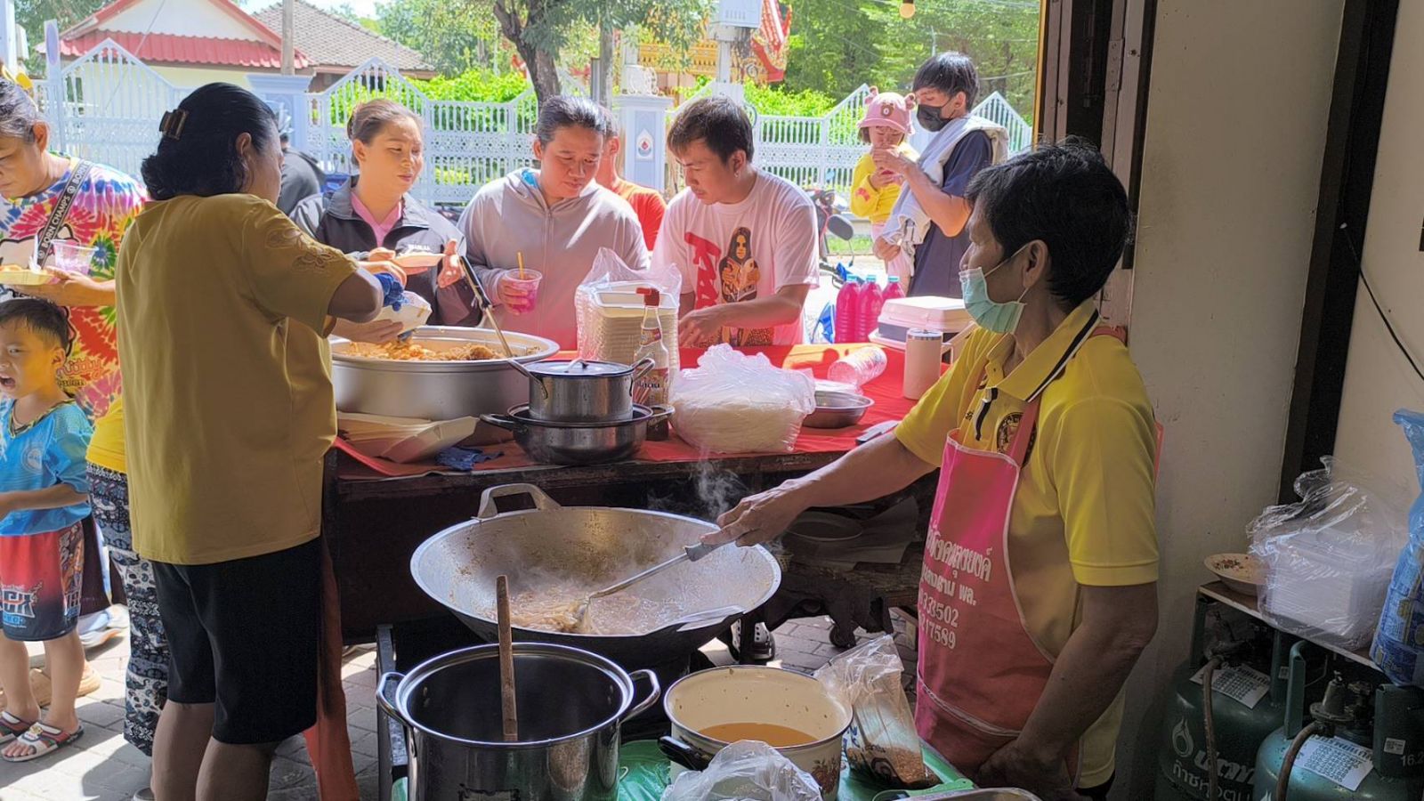นายเฉลิมศักดิ์ ปลื้มวงศ ์ (ตาเที่ยง) อายุ 63 ปี กล่าวว่า เนื่องในวันนวมินทรมหาราช เป็นวันคล้ายวันสวรรคต พระบาทสมเด็จพระบรมชนกาธิเบศร มหาภูมิพลอดุลยเดชมหาราช บรมนาถบพิตร รัชกาลที่ 9 ตนเองและครอบครัวจึงได้ทำผัดไทยใส่ไข่แจกให้ประชาชนตั้งแต่เที่ยงวันจนหมดใช้เส้นก๋วยเตี๋ยวกว่า 200 กิโลกรับ ใช้ไข่ไก่กว่า 300 ฟอง ถวายเป็นพระราชกุศลครั้งนี้ โดยมีประชาชนยืนเข้าเเถวยาวตั้งแต่ 10 โมงเช้า ซึ่งประชาชนที่เข้าแถวรอรับจะได้ผัดไทย 1 ห่อ น้ำ 1 แก้ว ขนมบัวลอยไข่หวาน 1 ถ้วย น้ำเปล่า 1 ขวด ไปรับประทาน