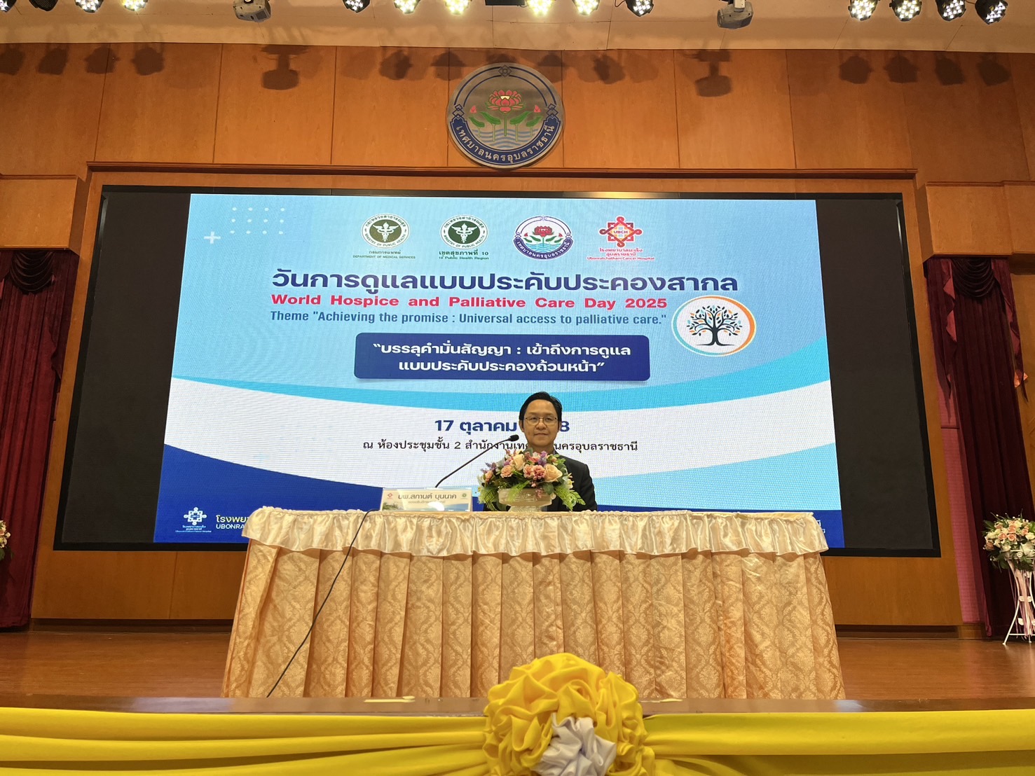 ที่ห้องประชุมชั้น 2 สำนักงานเทศบาลนครอุบลราชธานี อำเภอเมือง จังหวัดอุบลราชธานี ได้มีการจัดกิจกรรม โครงการ วันการดูแลแบบประคับประคองสากล ประจำปี 2568 “World Hospice and Palliative Care Day 2025” บรรลุคำมั่นสัญญา เข้าถึงการดูแลแบบประคับประคองถ้วนหน้า ขึ้น โดยมี นายแพทย์สกานต์ บุนนาค รองอธิบดีกรมการแพทย์ ร่วมด้วย นายแพทย์เฉลิมพล ไชยรัตน์ ผู้อำนวยการโรงพยาบาลมะเร็งอุบลราชธานี ,นายวรสิทธิ์ กัลป์ตินันท์ สมาชิกสภาผู้แทนราษฎร จังหวัดอุบลราชธานี เขต 1 ,นางสาวพิศทยา ไชยสงคราม นายกเทศมนตรีนครอุบลราชธานี ,คณะผู้บริหารโรงพยาบาลฯ ,บุคลากรทางการแพทย์และสาธารณสุข ทั้งในและนอกสังกัดกระทรวงสาธารณสุข ที่รับผิดชอบการดำเนินการดูแลผู้ป่วยแบบประคับประคอง ในเขตสุขภาพที่ 10 และ ภาคีเครือข่ายภาครัฐและภาคประชาชน ร่วมพิธีเปิดโครงการ ,มอบนโยบายด้านการดูแลแบบประคับประคอง ,เยี่ยมชม บูธ การนำเสนอผลงานนิทรรศการ การดูแลผู้ป่วย แบบประคับประคองและ ระยะท้ายจากภาคีเครือข่าย หน่วยงานในเขตสุขภาพที่ 10 และ กิจกรรม Workshop การดูแลผู้ป่วยมะเร็งแบบประคับประคองในแบบองค์รวม โรงพยาบาลมะเร็งอุบลราชธานี กรมการแพทย์ ได้ตระหนักถึงความสำคัญ ในการสร้างเวทีการแลกเปลี่ยนเรียนรู้ แบ่งปันประสบการณ์ ร่วมสร้างสรรค์ ยกระดับคุณภาพการดูแลผู้ป่วย แบบประคับประคอง การสร้างเครือข่ายการดำเนินการระหว่างหน่วยงานที่เกี่ยวข้อง เพื่อสนับสนุน การดำเนินงานตามยุทธศาสตร์สู่การปฏิบัติให้เป็นรูปธรรม ส่งผลให้ประชาชนเข้าถึงการดูแล แบบประคับประคองถ้วนหน้า