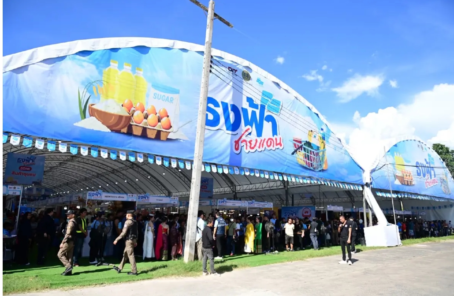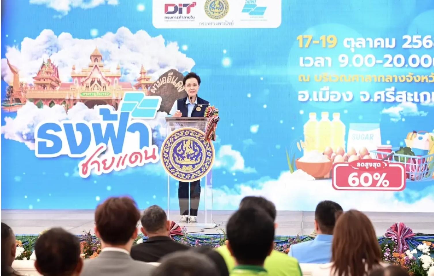 สำหรับงาน“มหกรรมธงฟ้าเยียวยาและกระตุ้นเศรษฐกิจชายแดน จังหวัดศรีสะเกษ” นั้นภายในงานมีการจำหน่ายสินค้าอุปโภคบริโภคราคาประหยัดกว่า 1,000 รายการ ครอบคลุม 10 หมวดสินค้า ลดราคาสูงสุดถึง 60% อาทิ บะหมี่กึ่งสำเร็จรูป ปลากระป๋อง ซอสปรุงรส น้ำยาซักผ้า เครื่องครัว เครื่องใช้ไฟฟ้า เครื่องแต่งกาย รวมถึงสินค้าชุมชนจากจังหวัดศรีสะเกษและจังหวัดชายแดนอีก 6 จังหวัด โดยจัดขึ้นระหว่างวันที่ 17–19 ตุลาคม 2568