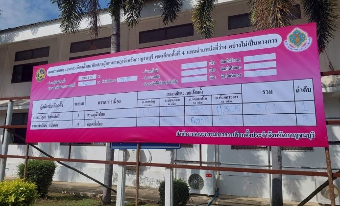 ผู้สื่อข่าวรายงานว่า วันนี้ 19 ต.ค.2568 คณะกรรมการประจำหน่วยเลือกตั้ง (กปน.)ได้ประกาศปิดหีบเลือกตั้ง เพื่อนับคะแนนผู้สมัครสมาชิกสภาผู้แทนราษฎรจังหวัดกาญจนบุรี เขตเลือกตั้งที่ 4 แทนตำแหน่งที่ว่าง อย่างพร้อมเพรียงกันทั้ง 254 หน่วยเลือกตั้ง ผู้มีสิทธิเลือกตั้ง 133,100 คน มีผู้มาใช้สิทธิเลือกตั้ง 96058 คน คิดเป็นร้อยละ 72.17 ผลคะแนนเลือกตั้งอย่างไม่เป็นทางการ ในเวลา 19.45 น.นับแล้ว 99.64% แยกเป็นรายอำเภอ ดังนี้