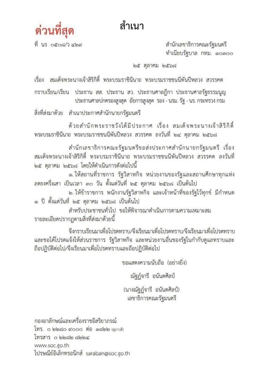 ตามที่ได้มีประกาศสํานักพระราชวัง เรื่อง สมเด็จพระนางเจ้าสิริกิติ์ พระบรมราชินีนาถ พระบรมราชชนนีพันปีหลวง สวรรคต ลงวันที่ 24 ตุลาคม 2568 นั้น รัฐบาลได้รับทราบด้วยความโทมนัสอย่างยิ่ง จึงเห็นสมควรประกาศ ดังต่อไปนี้
