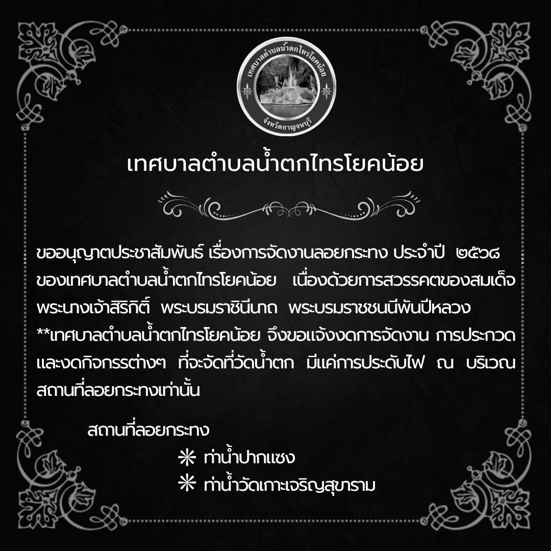 ผู้สื่อข่าวรายงานว่า วันนี้ 27 ต.ค.2568 เพจเฟสบุ๊ก “เทศบาลตำบลน้ำตกไทรโยคน้อย”ประกาศว่า เทศบาลตำบลน้ำตกไทรโยคน้อย จ.กาญจนบุรี งดการจัดงานประเพณีลอยกระทง ประจำปี 2568 ซึ่งมีกิจกรรมรื่นเริงต่าง ๆ ได้แก่ การประกวดนางนพมาศ การประกวดกระทง การแสดง และกิจกรรมต่างๆ ณ วัดน้ำตก เพื่อร่วมถวายความอาลัยและแสดงความจงรักภักดีอย่างสูงสุด เนื่องด้วยที่ สมเด็จพระนางเจ้าสิริกิติ์ พระบรมราชินีนาถ พระบรมราชชนนีพันปีหลวง เสด็จสวรรคต เมื่อวันที่ 24 ตุลาคม พุทธศักราช 2568