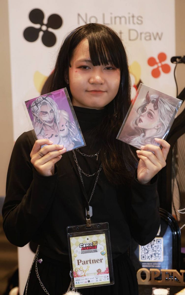 ขณะที่ นางสาวเวธินี โสดา หรือ น้องสาลี่ นักศึกษาชั้นปีที่ 1 สาขาการออกแบบกราฟิกดิจิทัลและภาพประกอบ คณะศิลปกรรมศาสตร์ มหาวิทยาลัยธุรกิจบัณฑิตย์ เปิดเผยความรู้สึกหลังได้ร่วมแสดงผลงานในงาน Comic Avenue 10 ว่า รู้สึกตื่นเต้นและภูมิใจอย่างมากที่ได้มีโอกาสนำผลงานของตนเองมาจัดแสดงในงานคอมมิกระดับประเทศเป็นครั้งแรก การได้เห็นผู้ชมเข้ามาชมและชื่นชอบผลงานของตนทำให้เกิดความมั่นใจมากขึ้นว่า เส้นทางศิลปะดิจิทัลสามารถพัฒนาเป็นอาชีพได้จริง พร้อมเกิดแรงบันดาลใจและไอเดียใหม่ ๆ ในการสร้างสรรค์ผลงานต่อไป