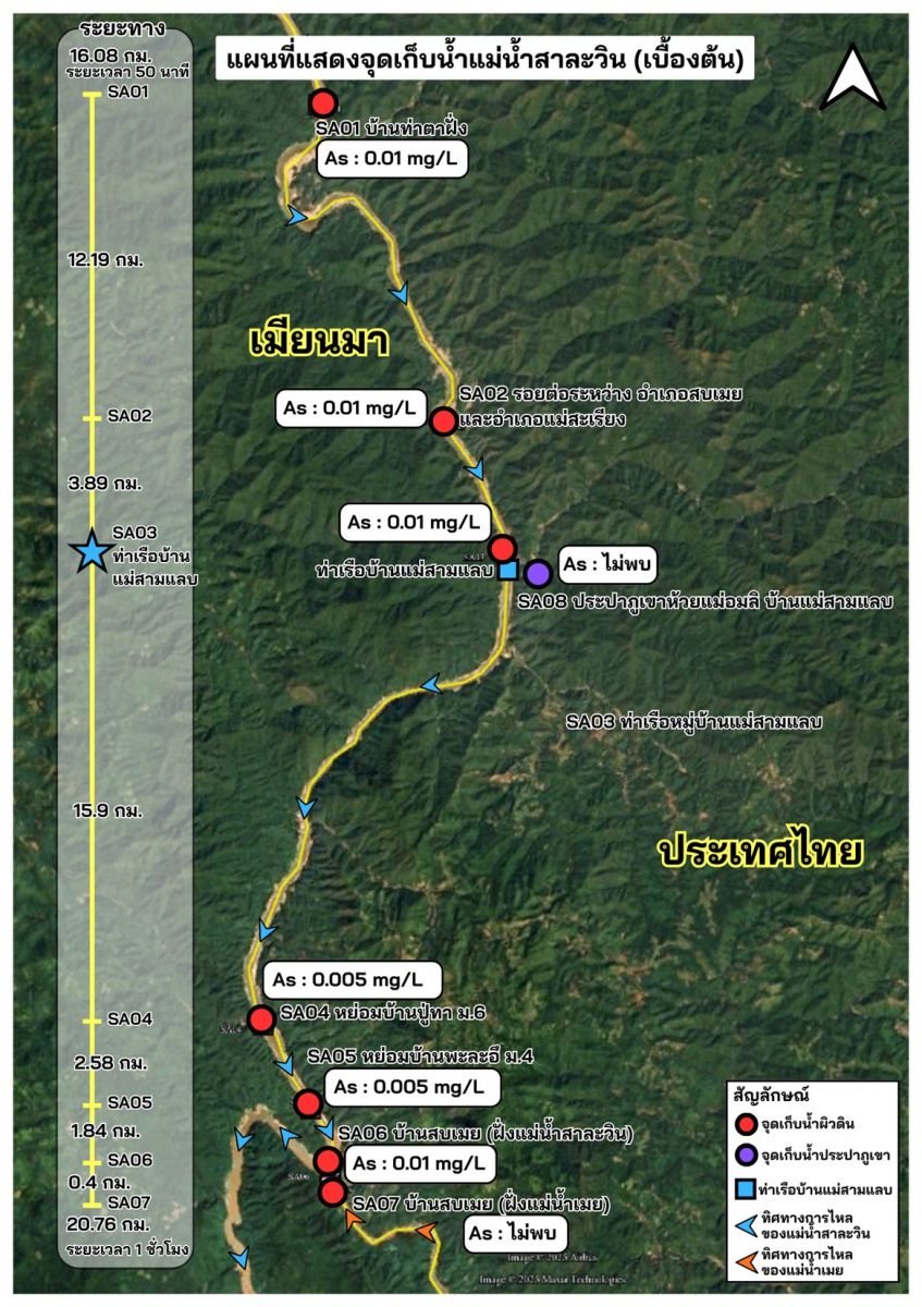 คพ.ตรวจเบื้องต้น พบสารหนูในแม่น้ำสาละวิน แต่ไม่เกินค่ามาตรฐาน วางแผนตรวจซ้ำ เก็บตัวอย่างเข้าห้องปฏิบัติการสิ่งแวดล้อม ประสาน GISTDA ใช้ดาวเทียมตรวจแหล่งที่มาสารหนู รองนายกฯ สุชาติ รุกแก้ไขปัญหาทั้งแม่น้ำกก แม่น้าสาย แม่น้ำโขง และแม่น้ำสาละวิน เร่งประสานทุกหน่วยงานที่เกี่ยวข้องร่วมทำความเข้าใจ – แก้ไขปัญหาให้พี่น้องประชาชน