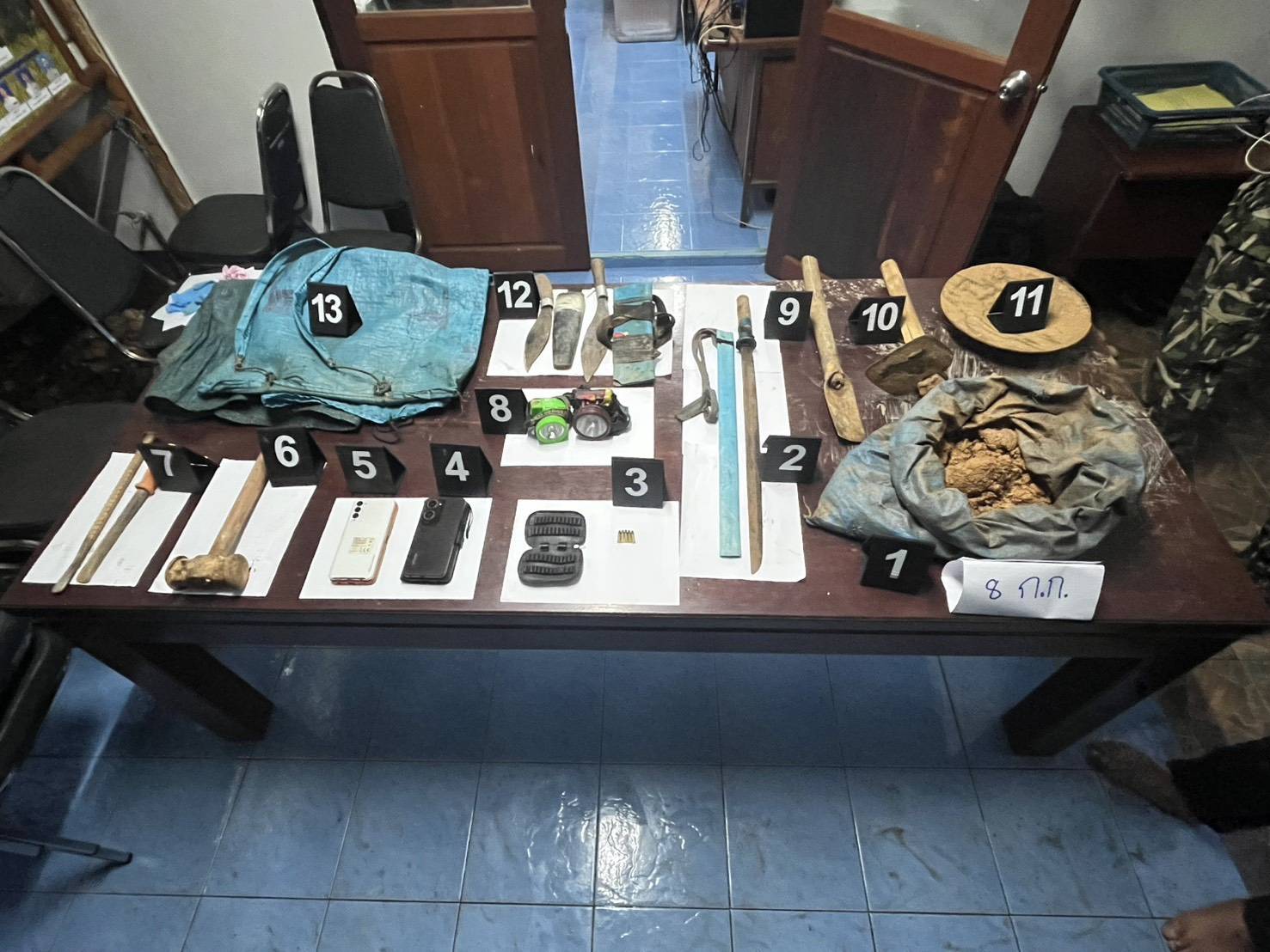 ผลการจับกุมพบ นายโซเอะเกดุ (ไม่มีนามสกุล) อายุ 34 ปี สัญชาติพม่า จากหมู่บ้านยาพู ประเทศเมียนมา แอบหลบอยู่ในหลุมขุดดิน พร้อมยึดของกลาง 13 รายการ ได้แก่ กระสอบดิน 8 กิโลกรัม, มีดดาบ, กระสุนปืน .22 LR จำนวน 5 นัด, โทรศัพท์มือถือ 2 เครื่อง, อุปกรณ์ขุดดินและร่อนแร่ รวมมูลค่าความเสียหาย 756,307 บาท ทั้งนี้ ผู้ต้องหาให้การว่าเดินทางเข้าเมืองไทยผ่านช่องทางธรรมชาติช่องป่าหมาก-ยาพู พร้อมเพื่อนอีก 3 คน โดยถูกชักชวนให้มาขุดดินหาแร่ทองคำ