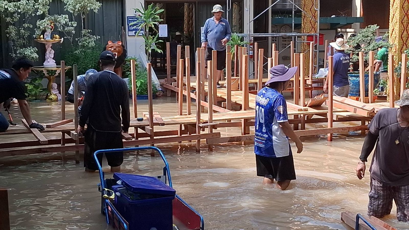 ผู้สื่อข่าวรายงานว่า เมื่อวันที่ 9 พ.ย. 68 นายธวัชชัย อึ้งอัมพรวิไล นายกเทศมนตรีเมืองบางกะดี พร้อมด้วย เจ้าหน้าที่จากเทศบาลฯ ได้ลงพื้นที่พร้อมนำไม้ท่อนและแผ่นกระดาน สำหรับทำสะพานและทำนั่งร้านยกของไว้ที่สูง ให้กับชาวชุมชนศาลาแดง ม.1 ต.บางกะดี อ.เมือง จ.ปทุมธานี โดยพบว่าชาวบ้านในชุมชนดังกล่าวกว่า 80 หลังคาเรือน ได้รับความเดือดร้อนจากน้ำเจ้าพระยาที่ล้นเอ่อเข้าท่วมพื้นที่ทั้งหมด โดยมีระดับน้ำสูง 1-1.5 เมตร ทำให้เส้นทางเข้าออกของชาวบ้านเป็นไปด้วยความยากลำบาก จึงต้องใช้ไม้ในการสร้างสะพานไว้สำหรับสัญจร เนื่องจากบางจุดมีระดับน้ำท่วมสูง รวมทั้งมีการเสริมสร้างสะพานให้กับวัดสังลาน ม.3 ต.บางกะดี ซึ่งทางพระและเณรไม่สามารถเดินออกมาบิณฑบาตรและรับกิจนิมนต์ได้