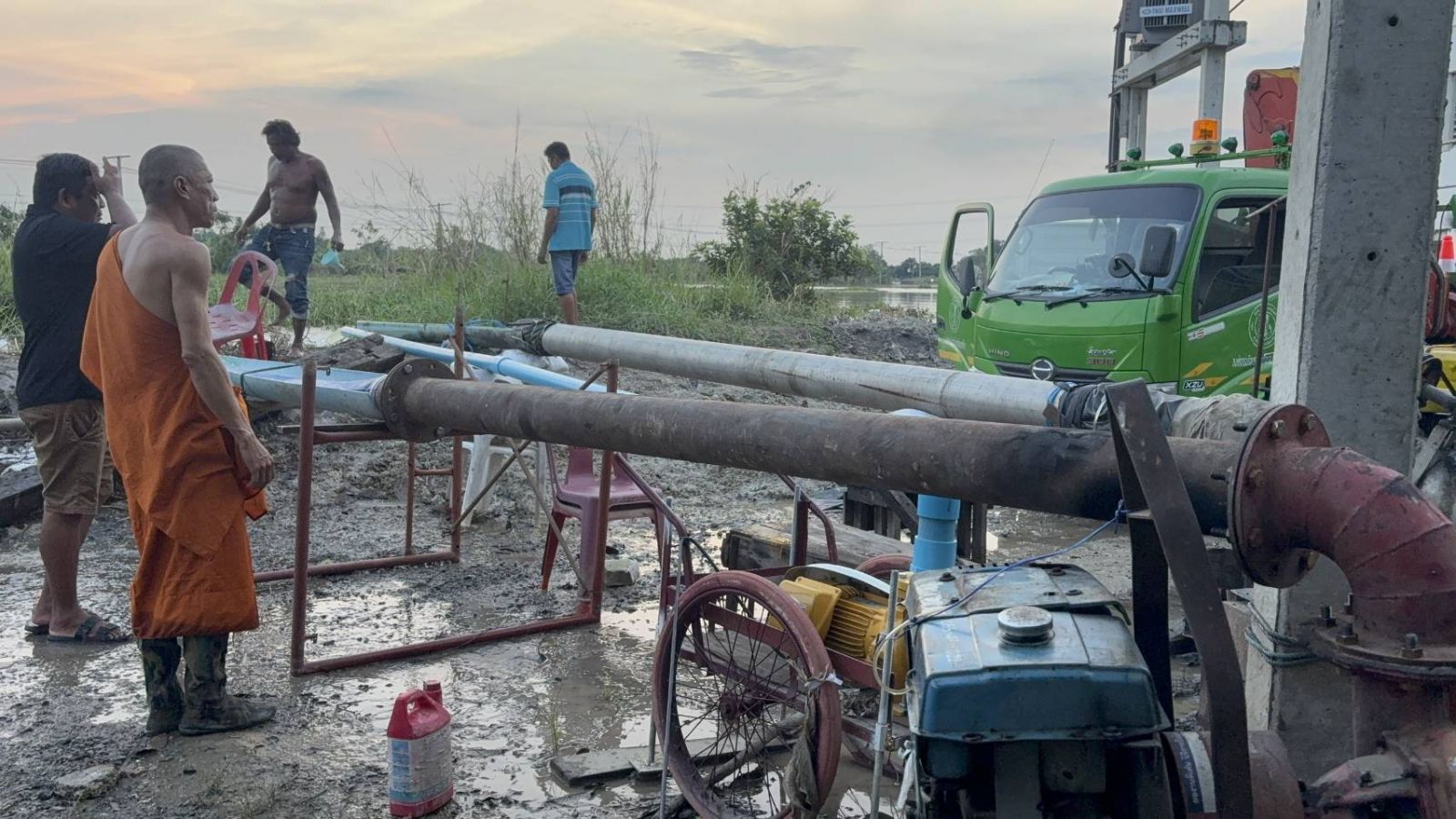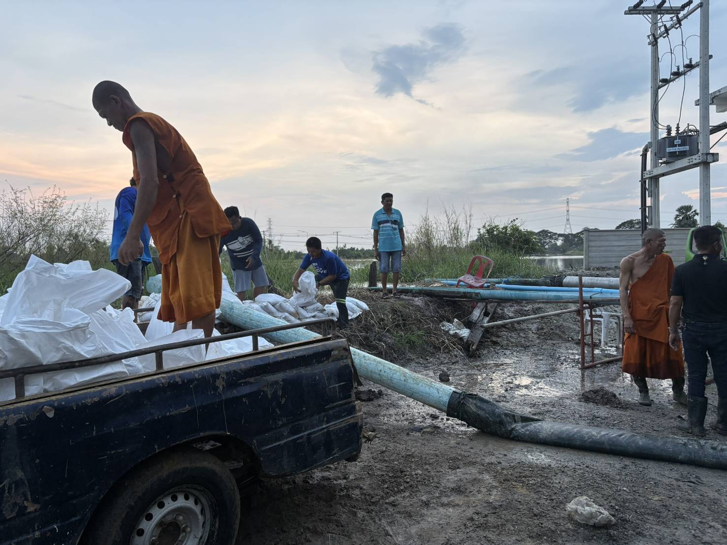ผู้สื่อข่าวรายงานว่า เมื่อช่วงเย็นวันที่ 10 พ.ย. 68 ที่วัดเมตารางค์ ต.เชียงรากน้อย อ.สามโคก จ.ปทุมธานี ซึ่งเป็นวัดที่อยู่ติดริมแม่น้ำเจ้าพระยาฝั่งตะวันออก ทางวัดได้นำกระสอบทรายมาทำคันกั้นน้ำ เพื่อป้องกันน้ำจากแม่น้ำเจ้าพระยาไม่ให้เข้าท่วมภายในวัด โดยคันกั้นสูงประมาณ 1.50 เมตร แต่พบว่าระดับน้ำนอกคันกั้นเพิ่มสูงขึ้นจนล้นคันกั้นน้ำของวัด อีกทั้งยังมีการซึมรั่วที่บริเวณฐานคันกั้นกระสอบทราย ทำให้น้ำไหลเข้าท่วมบริเวณวัด พระสงฆ์และชาวบ้านพร้อมเจ้าหน้าที่ อบต.เชียงรากน้อย ต้องมาช่วยกันเร่งนำกระสอบทรายมาเสริมระดับคันกั้นให้สูงขึ้นอีกชั้น พร้อมทั้งติดตั้งเครื่องสูบน้ำเพื่อระบายน้ำภายในวัดออก เป็นการช่วยลดระดับน้ำที่ท่วมภายในวัดจนไม่ให้สูงขึ้นมากกว่านี้