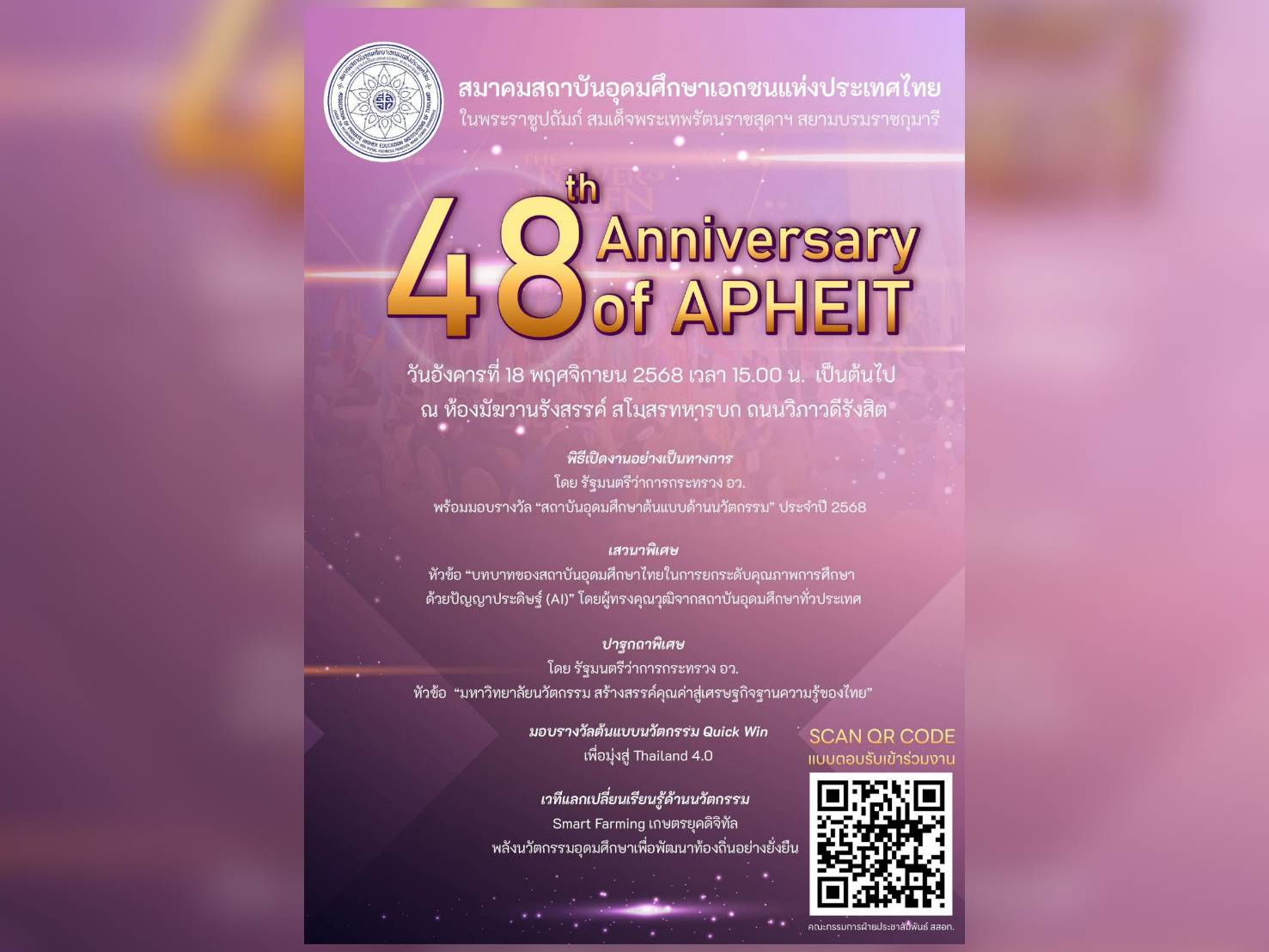 สมาคมสถาบันอุดมศึกษาเอกชนแห่งประเทศไทย ในพระราชูปถัมภ์ สมเด็จพระเทพรัตนราชสุดาฯ สยามบรมราชกุมารี หรือ สสอท. เตรียมจัดงานสถาปนาครบรอบ 48 ปี ในวันอังคารที่ 18 พฤศจิกายน 2568 ตั้งแต่เวลา 15.00 น. เป็นต้นไป ณ ห้องมัฆวานรังสรรค์ สโมสรทหารบก ถนนวิภาวดีรังสิต กรุงเทพฯ เพื่อแสดงศักยภาพของสถาบันอุดมศึกษาเอกชนในการพัฒนาการศึกษาไทยอย่างต่อเนื่อง และเปิดมุมมองใหม่ของอุดมศึกษาในยุคดิจิทัล โดยได้รับเกียรติจาก นายสุรศักดิ์ พันธ์เจริญวรกุล รัฐมนตรีว่าการกระทรวงการอุดมศึกษา วิทยาศาสตร์ วิจัยและนวัตกรรม (อว.) เป็นประธานเปิดงานและกล่าวปาฐกถาพิเศษหัวข้อ “มหาวิทยาลัยนวัตกรรม สร้างสรรค์คุณค่าสู่เศรษฐกิจฐานความรู้ของไทย” พร้อมมอบรางวัล ต้นแบบนวัตกรรม Quick Win เพื่อมุ่งสู่ Thailand 4.0 โดยมี รศ.ดร.ธนวรรธน์ พลวิชัย นายกสมาคม ดร.สมศักดิ์ รุ่งเรือง อดีตนายกสมาคม ดร.ดาริกา ลัทธพิพัฒน์ นายกรับเลือก ดร.เสนีย์ สุวรรณดี เลขาธิการ อาจารย์สมพงษ์ แก้วเจริญไพศาล รองเลขาธิการ พร้อมด้วยอธิการบดี คณาจารย์ บุคลากร นักศึกษา ในเครือข่ายสมาชิกสมาคมฯ เข้าร่วมงาน