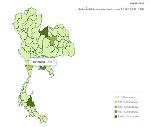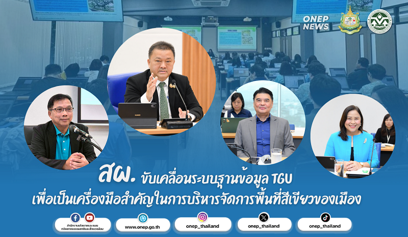 กระทรวงทรัพยากรธรรมชาติและสิ่งแวดล้อม โดยสำนักงานนโยบายและแผนทรัพยากรธรรมชาติและสิ่งแวดล้อม (สผ.) เผยแพร่ความสำคัญของพื้นที่สีเขียว พร้อมขับเคลื่อนระบบฐานข้อมูลด้านสิ่งแวดล้อมและพื้นที่สีเขียว (Thai Green Urban: TGU) ให้เป็นเครื่องมือของทุกภาคส่วนในการบริหารจัดการพื้นที่สีเขียวเมืองสอดคล้องกับแผนแม่บทภายใต้ยุทธศาสตร์ชาติ 20 ปี ที่ได้กำหนดเป้าหมายและตัวชี้วัดของพื้นที่สีเขียวเมืองไว้ที่ ร้อยละ 3 ภายในปี พ.ศ. 2570 และแนวทางปฏิบัติงานเพื่อขับเคลื่อนการจัดการพื้นที่สีเขียวอย่างยั่งยืน ระยะที่ 2 (พ.ศ. 2566 - 2570) ที่กำหนดเป้าหมายและตัวชี้วัดพื้นที่สีเขียวสาธารณะต่อประชากรไว้ที่ 10 ตารางเมตรต่อคน