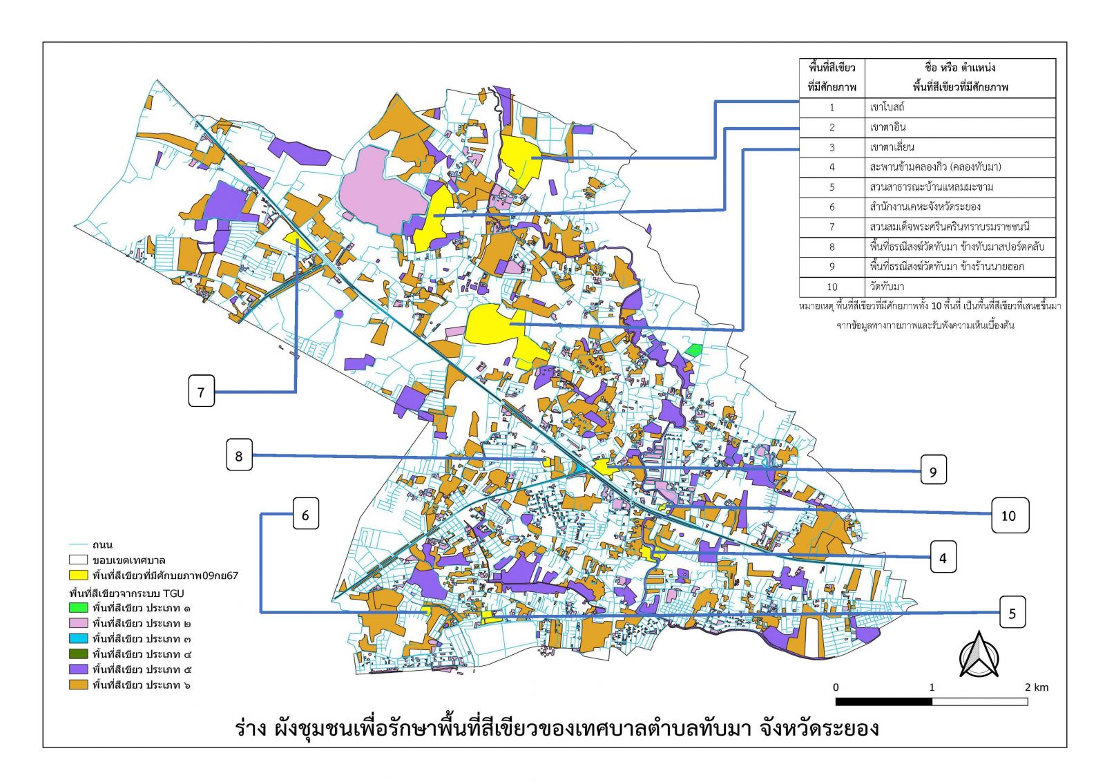 5. ร่วมกับเทศบาลในการนำข้อมูลพื้นที่สีเขียวประเภทต่าง ๆ ที่จัดเก็บในระบบฐานข้อมูล TGU มาจัดทำเป็นผังชุมชนเพื่อรักษาพื้นที่สีเขียว และกำหนดพื้นที่ที่มีศักยภาพในการพัฒนาเป็นพื้นที่สีเขียวสาธารณะ อาทิ เทศบาลตำบลทับมา จังหวัดระยอง และเทศบาลนครหาดใหญ่ จังหวัดสงขลา