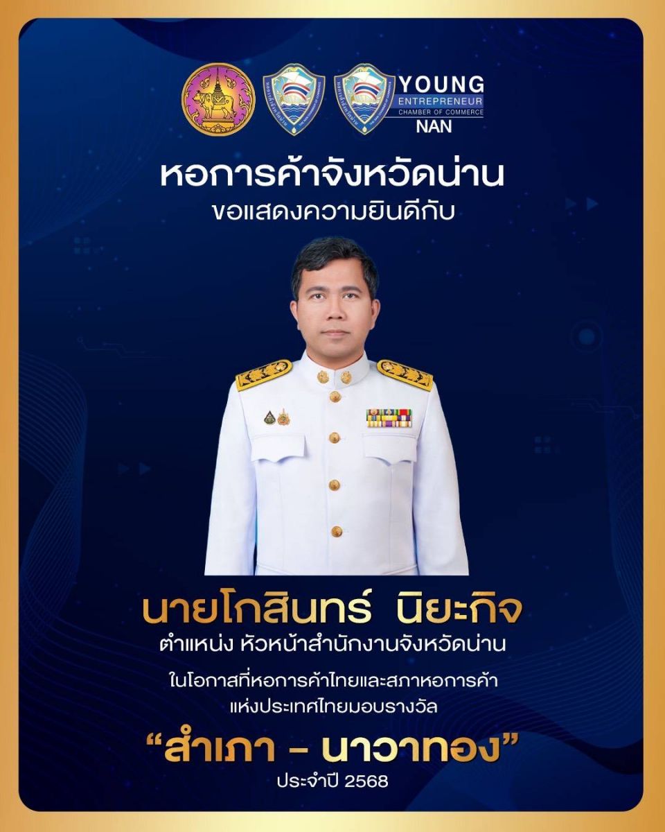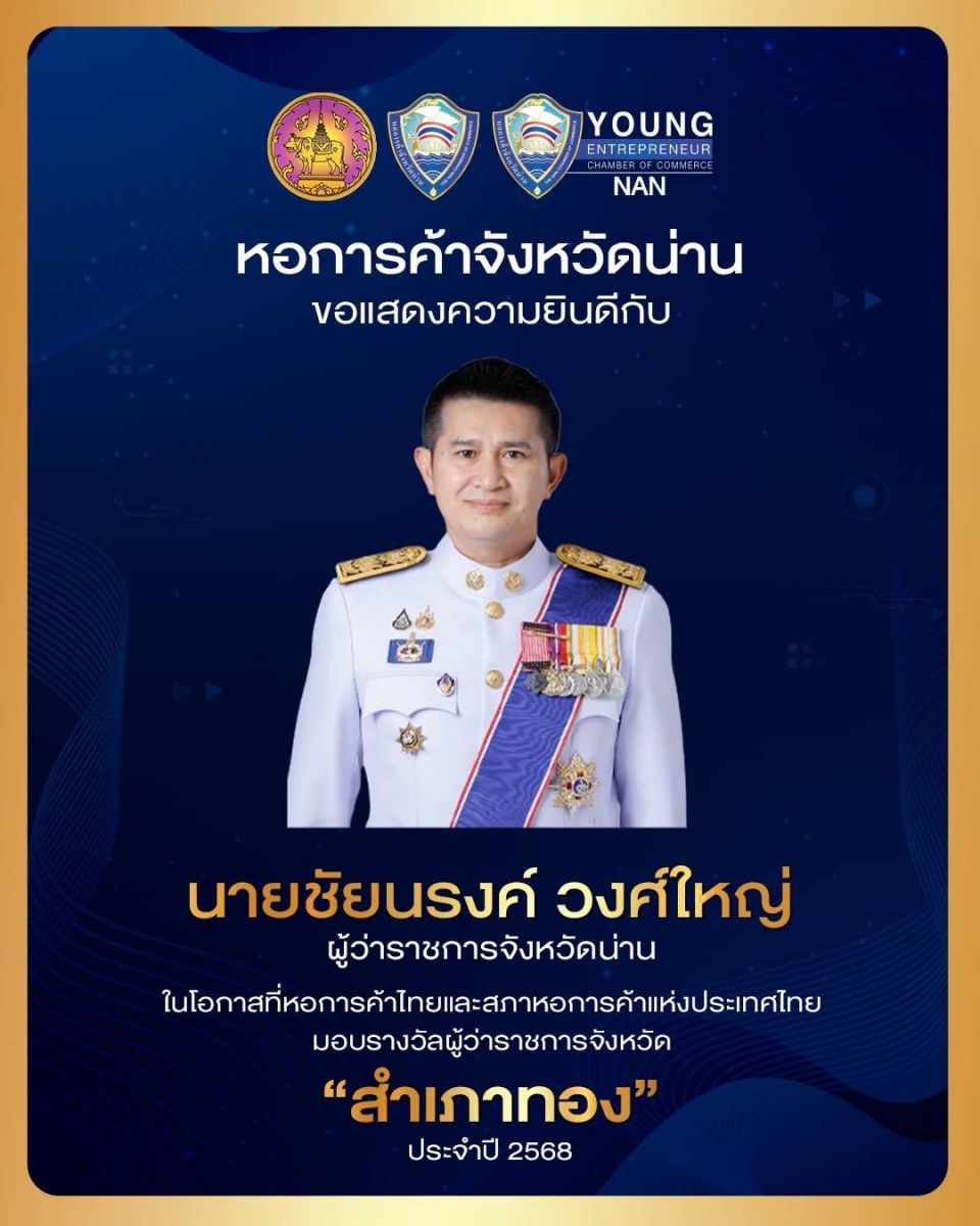 จังหวัดน่าน สร้างชื่อเสียงอีกครั้งบนเวทีระดับชาติ หลังคว้า 3 รางวัลใหญ่จากหอการค้าไทยและสภาหอการค้าแห่งประเทศไทย ในงานมอบรางวัล “สำเภาทอง” ประจำปี 2568 ซึ่งจัดขึ้นเพื่อเชิดชูผู้บริหารภาครัฐ ภาคเอกชน และบุคลากรผู้สร้างผลงานโดดเด่นด้านการขับเคลื่อนเศรษฐกิจและสังคมของประเทศ