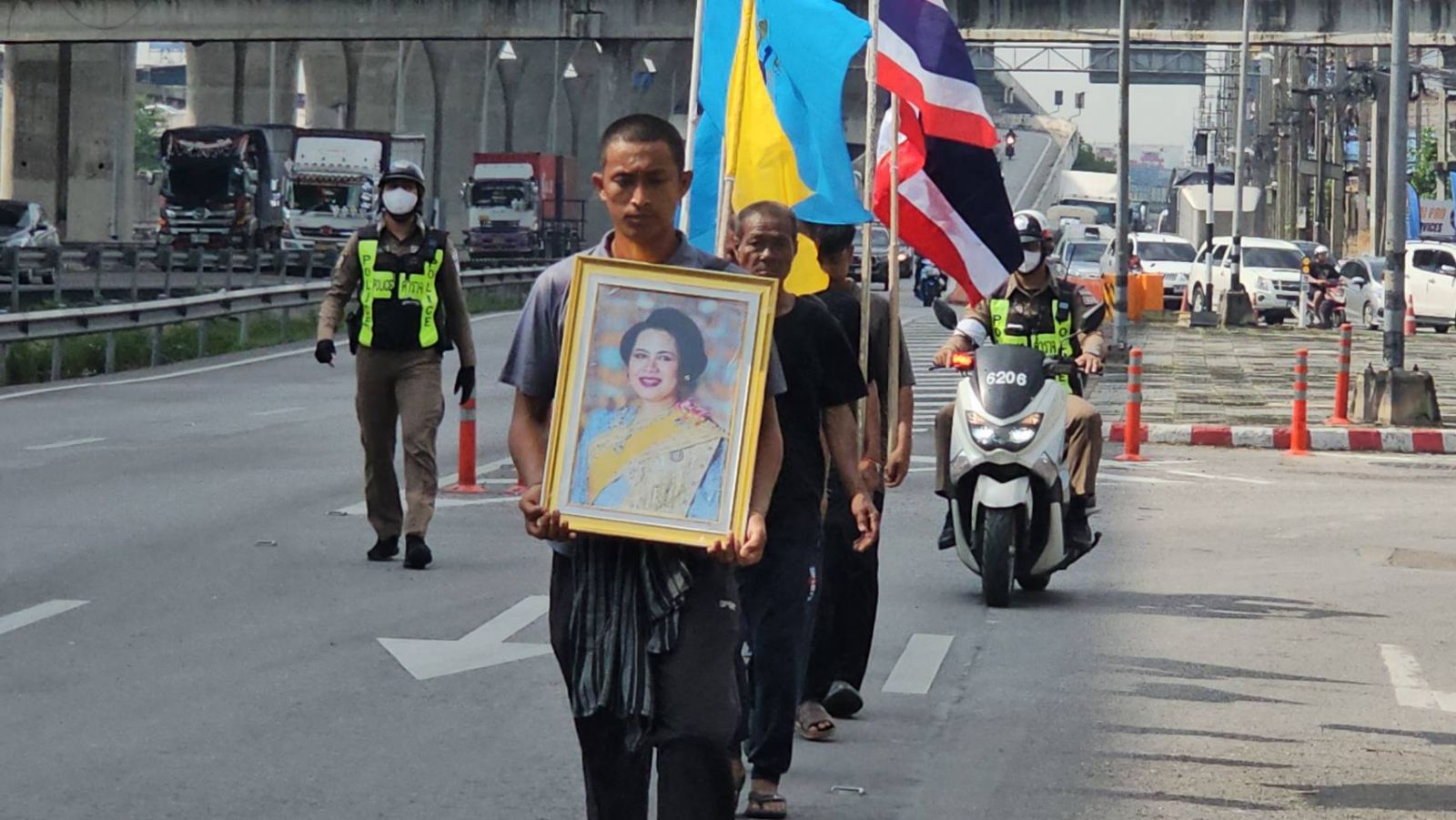 นายสิทธิชัย ทองสุวรรณ อายุ 27 ปี ชาวอำเภอไชยา จังหวัดสุราษฎร์ธานี ผู้ถือพระฉายาลักษณ์ของสมเด็จพระพันปีหลวง เปิดเผยว่า ตนและครอบครัวประกอบอาชีพทำสวนยางพาราและปาล์มน้ำมัน ได้ออกเดินทางจากบ้านเกิดตั้งแต่วันที่ 26 ตุลาคม 2568 หลังทราบข่าวการเสด็จสวรรคตของสมเด็จพระพันปีหลวง จึงเกิดความตั้งใจแน่วแน่ว่าจะเดินเท้าเข้ากรุงเทพมหานคร เพื่อกราบถวายบังคมพระบรมศพด้วยความอาลัยและสำนึกในพระมหากรุณาธิคุณอันยิ่งใหญ่ ซึ่งการเดินทางครั้งนี้ได้มาพร้อมกับพ่อตา อายุ 63 ปี และญาติพี่น้องผู้ชายในครอบครัวร่วมเดินทางมาด้วย รวมทั้งหมด 7 คน โดยมีรถกระบะ 1 คันซึ่งเป็นครูในจังหวัดประจวบคีรีขันธ์อาสาขับตามเพื่อช่วยขนสัมภาระและของจำเป็น อีกทั้งยังมีเจ้าหน้าที่ตำรวจ,อาสาของแต่ละพื้นที่ช่วยดูแลความปลอดภัยด้วย ระหว่างทางค่ำไหนนอนนั่น ตลอดเส้นทางมีประชาชนจำนวนมากออกมาให้กำลังใจ บางคนมอบน้ำและอาหารให้ ถือเป็นแรงใจที่ยิ่งใหญ่