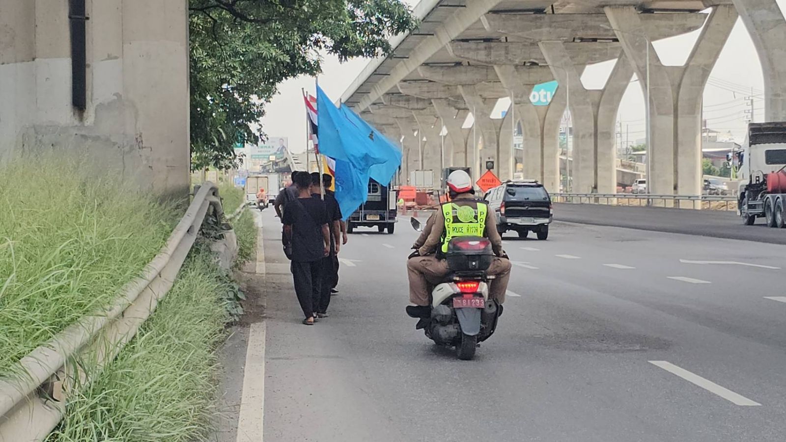 ทั้งนี้ผู้สื่อข่าวรายงานเพิ่มเติมด้วยว่า หลังจากกลุ่มคนเดินเท้าทั้ง 7 จากภาคใตัผ่านตลาดกลางกุ้งสมุทรสาคร ผ่านทางเข้าตัวเมืองมหาชัย ก็ไปถึงจุดที่มีการวางศิลาฤกษ์สร้างหน่วยบริการประชาชนตำรวจทางหลวงมหาชัยนั้น ทางเจ้าหน้าที่ ทล.ได้เชิญทั้ง 7 คน แวะพักและร่วมรับประทาน อาหาร สร้างพลังกาย เสริมกำลังใจ ก่อนที่จะออกเดินทางกันต่อไป
