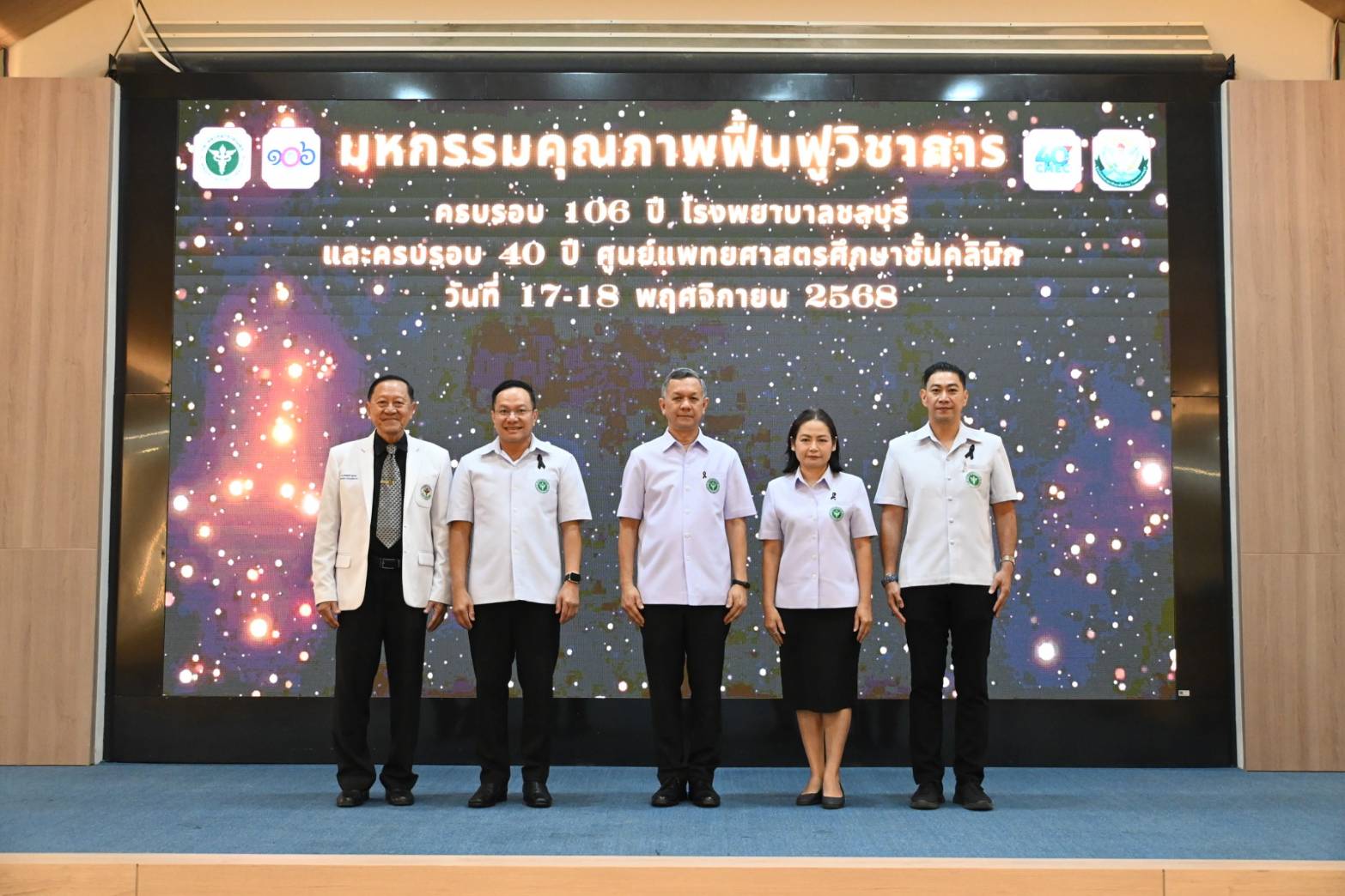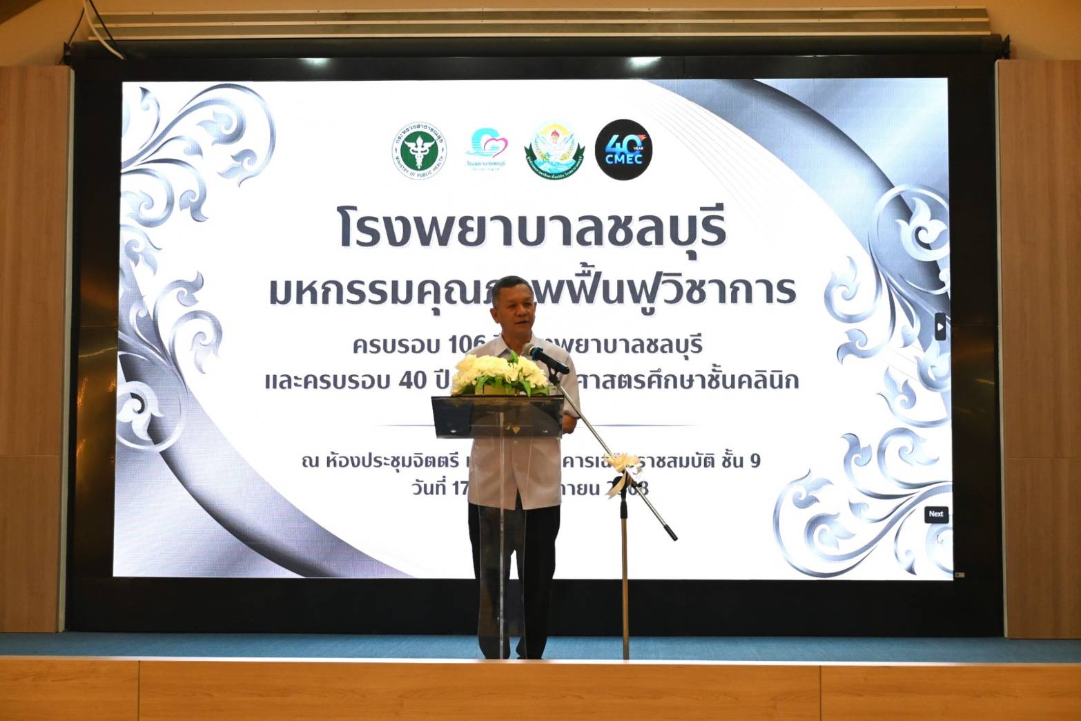 ดร.นพ.พงศธร พอกเพิ่มดี อธิบดีกรมการแพทย์แผนไทยและการแพทย์ทางเลือก เป็นประธานเปิดการประชุมงานมหกรรมคุณภาพฟื้นฟูวิชาการ โรงพยาบาลชลบุรี ประจำปี พ.ศ. 2568 เนื่องในโอกาสครบรอบ 106 ปี โรงพยาบาลชลบุรี 40 ปี ศูนย์แพทยศาสตรศึกษาชั้นคลินิก ณ ห้องประชุมจิตตรี แน่นหนา อาคารเฉลิมราชสมบัติ ชั้น 9 โรงพยาบาลชลบุรี โดยมี ผู้ตรวจราชการกระทรวงสาธารณสุข เขตสุขภาพที่ 6 สาธา รณสุขนิเทศก์ เขตสุขภาพที่ 6 นายแพทย์สาธารณสุขจังหวัดชลบุรี คณะผู้บริหารโรงพยาบาลศูนย์ โรงพยาบาลทั่วไป ผู้อำนวยการโรงพยาบาลชลบุรี คณะผู้บริหารในเครือข่ายเขตสุขภาพที่ 6 วิทยากร ผู้อำนวยการโรง พยาบาลชลบุรี พร้อมด้วยคณะผู้บริหาร แพทย์ พยาบาล เจ้าหน้าที่โรงพยาบาลชลบุรี และคณะแพทย์แผนไทย ร่วมให้การต้อนรับ