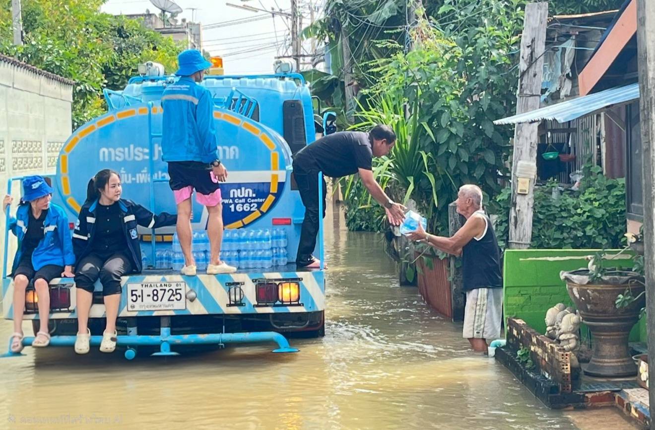 ในพื้นที่ประสบภัย โดยสนับสนุนน้ำดื่มบรรจุขวดตราสัญลักษณ์ กปภ. และนำรถบรรทุกน้ำประปาแจกจ่ายให้บริการโดยไม่คิดมูลค่า เพื่อให้ทุกครัวเรือนมีน้ำสะอาดใช้อุปโภคบริโภคอย่างต่อเนื่อง