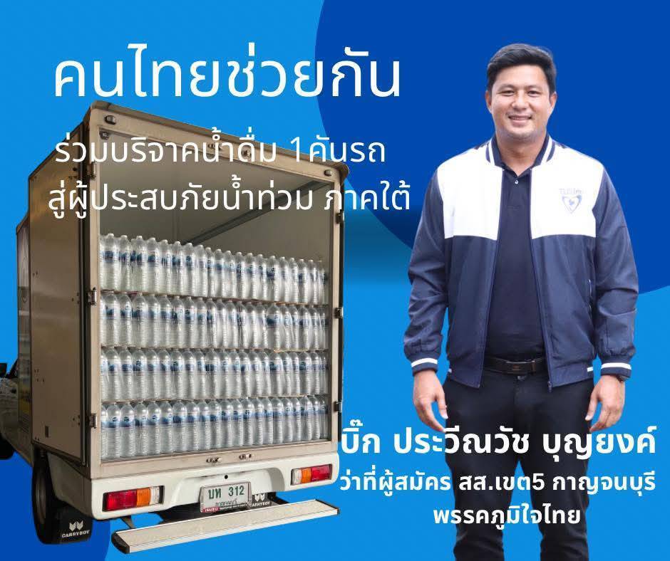 ด้านนายประวีณ วัชบุญยงค์ ว่าที่ผู้สมัคร ส.ส. เขต 5 กาญจนบุรี พรรคภูมิใจไทย มอบน้ำดื่ม 1 คันรถ สู่ภาคใต้ ร่วมด้วยช่วยกันครับ เพื่อเป็นกำลังให้กับผู้ประสบภัย และเจ้าหน้าที่ทุกท่าน ผ่านวิกฤตนี้ไปได้โดยเร็ว ขณะที่มูลนิธิพิทักษ์กาญจน์ ร่วมรับบริจาคสิ่งของข้าวสารอาหารแห้งจากพ่อแม่พี่น้องชาวทองผาภูมิ ได้และส่งต่อให้พี่น้องชาวหาดใหญ่ในวันนี้ ตั้งแต่เวลาตั้งแต่ 8:00 น. ถึง 15:00 น. มาบริจาคที่มูลนิธิพิทักษ์กาญจน์ทองผาภูมิ สามแยกไฟแดงทองผาภูมิ