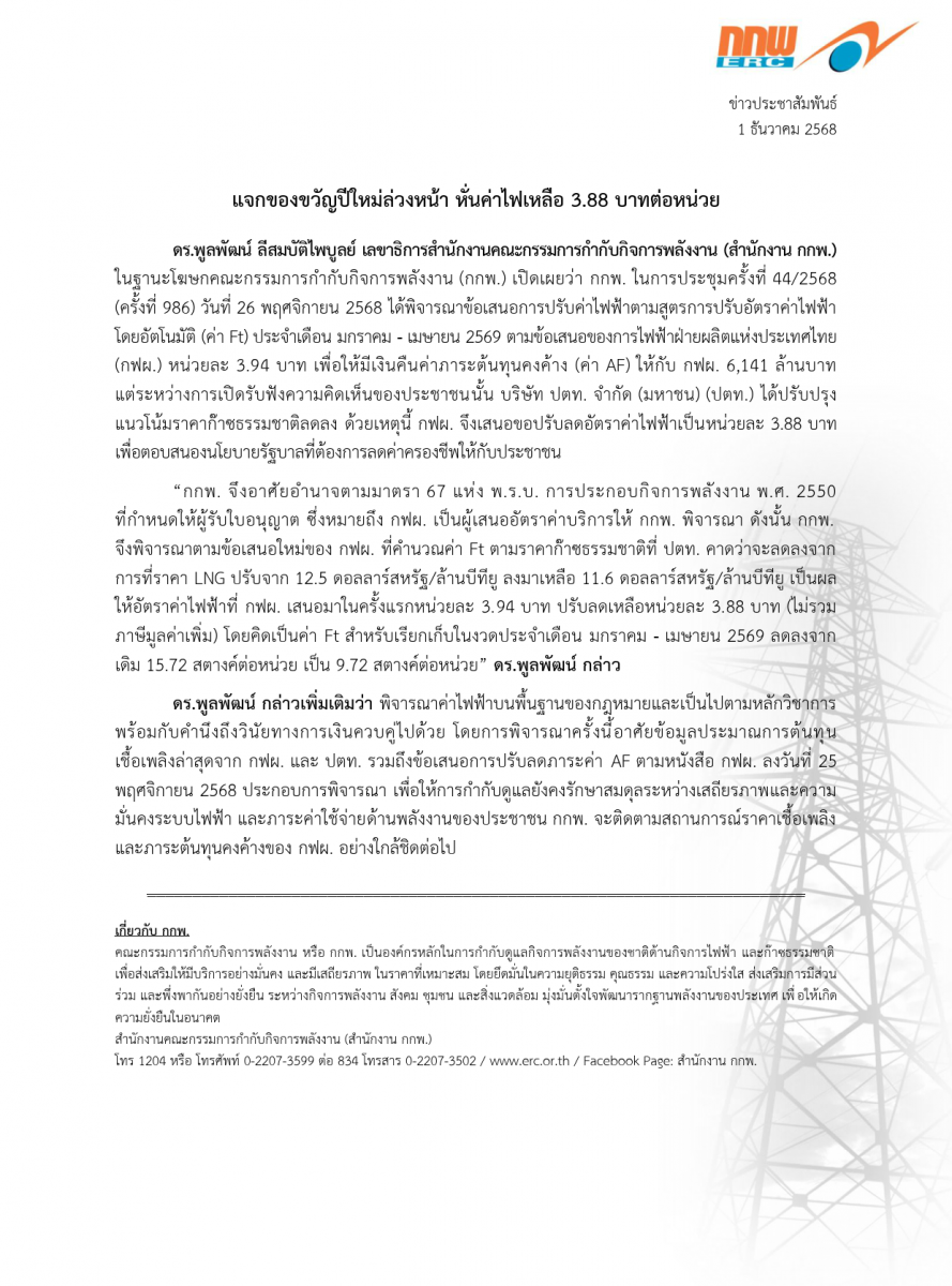 ดร.พูลพัฒน์ ลีสมบัติไพบูลย์ เลขาธิการสำนักงานคณะกรรมการกำกับกิจการพลังงาน (สำนักงาน กกพ.) ในฐานะโฆษกคณะกรรมการกำกับกิจการพลังงาน (กกพ.) เปิดเผยว่า กกพ. ในการประชุมครั้งที่ 44/2568 (ครั้งที่ 986) วันที่ 26 พฤศจิกายน 2568 ได้พิจารณาข้อเสนอการปรับค่าไฟฟ้าตามสูตรการปรับอัตราค่าไฟฟ้าโดยอัตโนมัติ (ค่า Ft) ประจำเดือน มกราคม - เมษายน 2569 ตามข้อเสนอของการไฟฟ้าฝ่ายผลิตแห่งประเทศไทย (กฟผ.) หน่วยละ 3.94 บาท เพื่อให้มีเงินคืนค่าภาระต้นทุนคงค้าง (ค่า AF) ให้กับ กฟผ. 6,141 ล้านบาท แต่ระหว่างการเปิดรับฟังความคิดเห็นของประชาชนนั้น บริษัท ปตท. จำกัด (มหาชน) (ปตท.) ได้ปรับปรุงแนวโน้มราคาก๊าซธรรมชาติลดลง ด้วยเหตุนี้ กฟผ. จึงเสนอขอปรับลดอัตราค่าไฟฟ้าเป็นหน่วยละ 3.88 บาท เพื่อตอบสนองนโยบายรัฐบาลที่ต้องการลดค่าครองชีพให้กับประชาชน