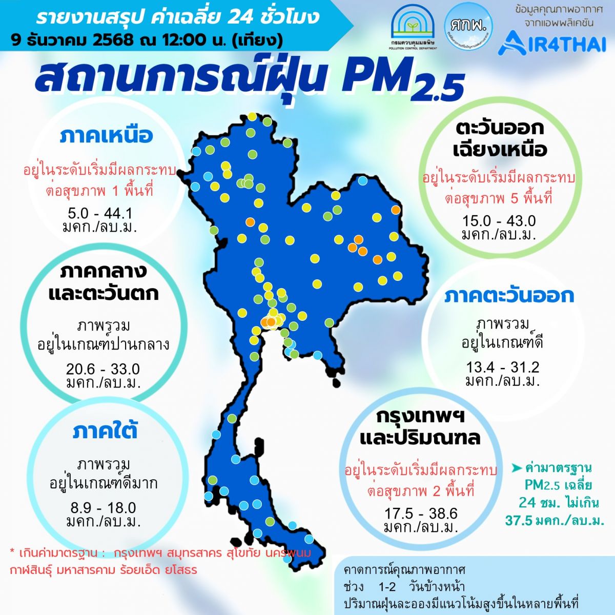 ศูนย์สื่อสารการแก้ไขปัญหามลพิษทางอากาศ (ศกพ.) กรมควบคุมมลพิษ รายงานคุณภาพอากาศประจำวันที่ 9 ธันวาคม 2568 ณ 12:00 น ภาพรวมปริมาณฝุ่นละออง PM2.5 ในประเทศ เริ่มขยับสูงขึ้นในบางพื้นที่ โดยพบเกินค่ามาตรฐานใน (สีส้ม) บางจังหวัดในพื้นที่ภาคตะวันออกเฉียงเหนือ ได้แก่ นครพนม กาฬสินธุ์ มหาสารคาม ร้อยเอ็ด และยโสธร พื้นที่ภาคเหนือตอนล่าง พบเกินค่ามาตรฐานที่จังหวัดสุโขทัย ในขณะที่พื้นที่กรุงเทพมหานครและปริมณฑล พบเกินค่ามาตรฐาน 2 แห่ง โดยภาคเหนือ ตรวจวัดได้ 5.0 – 44.1 ไมโครกรัมต่อลูกบาศก์เมตร (มคก./ลบ.ม.) ภาคตะวันออกเฉียงเหนือ 15.0 – 43.0 มคก./ลบ.ม. ภาคกลางและภาคตะวันตก 20.6 - 33.0 มคก./ลบ.ม. ภาคตะวันออก 13.4 - 31.2 มคก./ลบ.ม. ภาคใต้ 8.9 - 18.0 มคก./ลบ.ม. กรุงเทพมหานครและปริมณฑล 17.5 - 38.6 มคก./ลบ.ม.