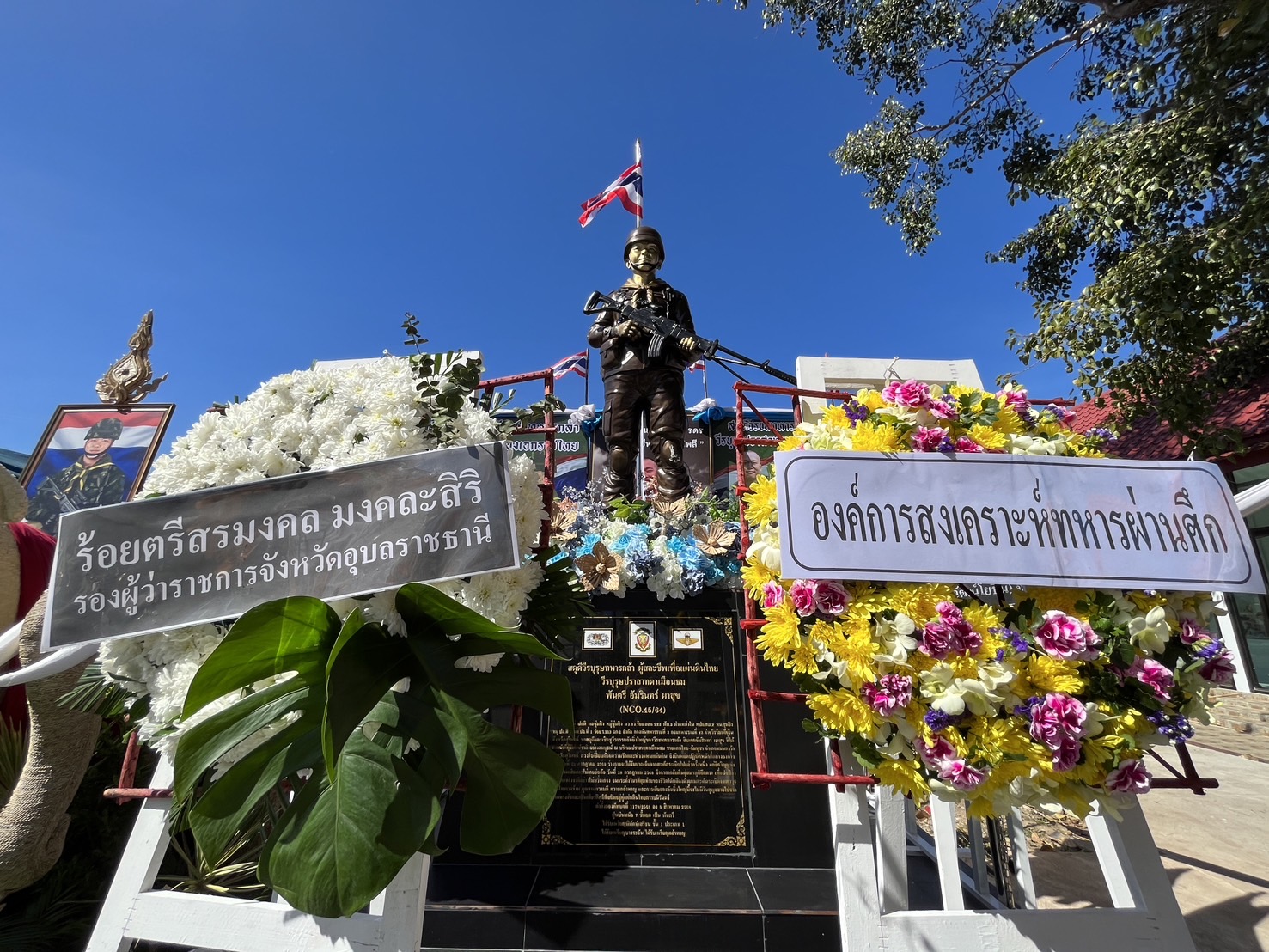 ครอบครัวทหารผู้กล้า และชาวบ้านทำบุญครบ 100 วัน ส.อ.อัมรินทร์ ผาสุก ตำแหน่งพลซุ่มยิง กองพันทหารราบที่ 3 กรมทหารราบที่ 23 กองพลทหารราบที่ 3 ซึ่งเสียชีวิตจากการปฏิบัติหน้าที่ในพื้นที่ปราสาทตาเมือน อ.พนมดงรัก จ.สุรินทร์ วันที่ 28 ก.ค.2568 พร้อมทำพิธีบวงสรวงอนุสาวรีย์ทหารผู้กล้า ซึ่งจัดสร้างให้รู้ว่าหมู่บ้านแห่งนี้ มีวีระบุรุษผู้กล้าที่ได้เสียสละเลือดเนื้อและชีวิตเข้าแลกเพื่อปกป้องพื้นแผ่นดินไทย