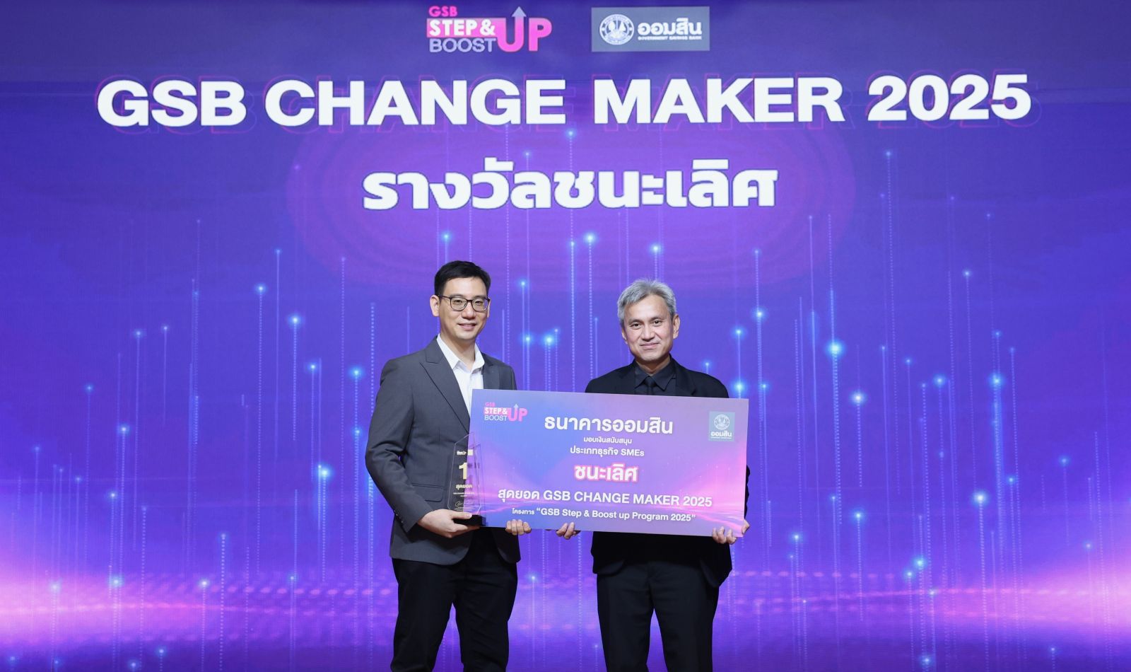 โครงการ GSB STEP & BOOST UP PROGRAM มุ่งพัฒนาผู้ประกอบการ SMEs ผู้ประกอบการรายย่อย ธุรกิจ SMEs Start Up และวิสาหกิจชุมชน ผ่าน 4 ขั้นตอน ได้แก่ การอบรมด้านบริหาร การตลาด นวัตกรรมเทคโนโลยี พร้อมกิจกรรมเวิร์กชอปที่เสริมทักษะด้านดิจิทัล การออกแบบโมเดลธุรกิจแห่งอนาคต การพัฒนาผลิตภัณฑ์ที่ตอบโจทย์ความยั่งยืน รวมถึงการให้คำปรึกษาแบบตัวต่อตัวผ่าน Biz Clinic และการติดตามผลการพัฒนาสินค้า บรรจุภัณฑ์ และกลยุทธ์การตลาดที่เกิดขึ้นอย่างเป็นรูปธรรม ก่อนคัดเลือก 15 ผู้ประกอบการเข้าสู่รอบประกวดการนำเสนอแผนธุรกิจ เพื่อเฟ้นหา “สุดยอด GSB Change Maker 2025” ชิงทุนพัฒนารวมกว่า 500,000 บาท โดยพิจารณาจากศักยภาพทางธุรกิจและนวัตกรรมเชิงพาณิชย์ การพัฒนาความรู้ความเข้าใจตลาดและการออกแบบผลิตภัณฑ์ตามมาตรฐานขั้นต้น การต่อยอดและการเติบโตในอนาคต และการสร้างคุณค่าร่วมกับชุมชนและสิ่งแวดล้อม โดยมี นายพีระยุทธ บุญสวาท ผู้ช่วยผู้อำนวยการธนาคารออมสิน เป็นประธานในพิธีประกาศผลและมอบรางวัล “สุดยอด GSB Change Maker 2025” ให้แก่ผู้ประกอบการทั้ง 15 ราย ณ หอประชุมบุรฉัตร ธนาคารออมสิน สำนักงานใหญ่ แบ่งเป็น 2 ประเภท ดังนี้
