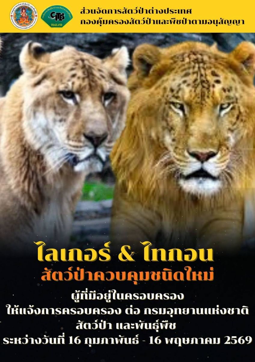 นายอรรถพล เจริญชันษา อธิบดีกรมอุทยานแห่งชาติ สัตว์ป่า และพันธุ์พืช เปิดเผยว่า กระทรวงทรัพยากรธรรมชาติและสิ่งแวดล้อมออกประกาศ เรื่อง กำหนดชนิดสัตว์ป่าควบคุมที่ต้องแจ้งการครอบครอง (ฉบับที่ 2) พ.ศ. 2568 ทั้งนี้ประกาศดังกล่าว ส่งผลให้ "ไลเกอร์” (Liger) และ “ไทกอน” (Tigon) สัตว์ลูกผสมจากการผสมข้ามสายพันธุ์ระหว่างสิงโตกับเสือโคร่ง ซึ่งตามนิยามเดิมไม่ได้ถูกจัดเป็นสัตว์ป่าคุ้มครองหรือสัตว์ป่าต่างประเทศที่ต้องแจ้งการครอบครอง ทำให้บุคคลทั่วไปสามารถครอบครองได้โดยไม่ต้องขออนุญาต และไม่มีมาตรการกำกับดูแลที่ชัดเจน ทำให้เกิดช่องว่างทางกฎหมาย ทั้งในด้านการเลี้ยงดู ความปลอดภัย และการตรวจสอบที่มาของสัตว์