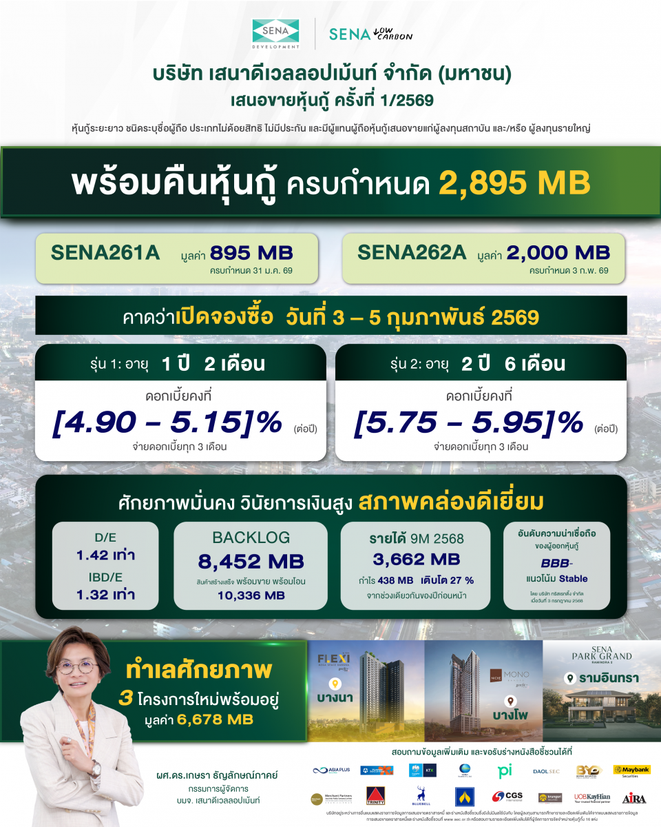บริษัท เสนาดีเวลลอปเม้นท์ จำกัด (มหาชน) หรือ “SENA” ผู้นำด้านการพัฒนาที่อยู่อาศัยอย่างยั่งยืน (Sustainable Living Leader) ตอกย้ำศักยภาพทางการเงินที่มั่นคงและมีวินัยทางการเงินที่เข้มแข็ง มั่นใจทุกการลงทุน โดย SENA เตรียมเงินพร้อมชำระคืนหุ้นกู้ครบกำหนด รุ่น SENA261A มูลค่า 895 ล้านบาท ในวันที่ 31 มกราคม พ.ศ. 2569 และ รุ่น SENA262A มูลค่า 2,000 ล้านบาท ในวันที่ 3 กุมภาพันธ์ พ.ศ. 2569 ควบคู่กับการเตรียมเสนอขายหุ้นกู้ ครั้งที่ 1/2569 ให้แก่ผู้ลงทุนสถาบัน และ/หรือผู้ลงทุนรายใหญ่ จำนวน 2 ชุด ได้แก่ หุ้นกู้ชุดที่ 1 อายุ 1 ปี 2 เดือน อัตราดอกเบี้ยคงที่ [4.90 - 5.15]% ต่อปี และ หุ้นกู้ชุดที่ 2 อายุ 2 ปี 6 เดือน อัตราดอกเบี้ยคงที่ [5.75 - 5.95]% ต่อปี จ่ายดอกเบี้ยทุก ๆ 3 เดือน คาดเปิดจองซื้อระหว่างวันที่ 3 – 5 กุมภาพันธ์ พ.ศ. 2569 ผ่านสถาบันการเงินชั้นนำ 16 แห่ง