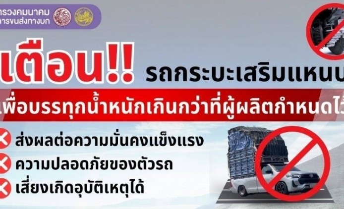 กรมการขนส่งทางบก เตือนรถกระบะดัดแปลงรถเสริมแหนบเพื่อใช้งานบรรทุกน้ำหนักมากขึ้น เกินกว่าสมรรถนะและมาตรฐานความปลอดภัย เสี่ยงอันตรายทั้งต่อตนเองและผู้ใช้ถนนอื่น