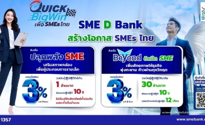 SME D Bank เปิดตัว 2 โครงการสินเชื่อใหม่ ขับเคลื่อนนโยบาย “Quick Big Win เพื่อ SMEs ไทย” ของรัฐบาล ได้แก่ “สินเชื่อปลุกพลัง SME” และ “สินเชื่อ Beyond ติดปีก SME” วงเงินรวม 20,000 ล้านบาท หนุนเอสเอ็มอีเข้าถึงแหล่งทุนดอกเบี้ยพิเศษเพียง 3% ต่อปี คงที่ตลอด 3 ปีแรก ผ่อนนาน 10 ปี วงเงินกู้สูงสุดถึง 30 ล้านบาท ช่วยเสริมสภาพคล่อง ลดต้นทุนการเงิน สามารถสนับสนุนเดินหน้าธุรกิจได้เต็มกำลัง สร้างการเติบโตอย่างยั่งยืน