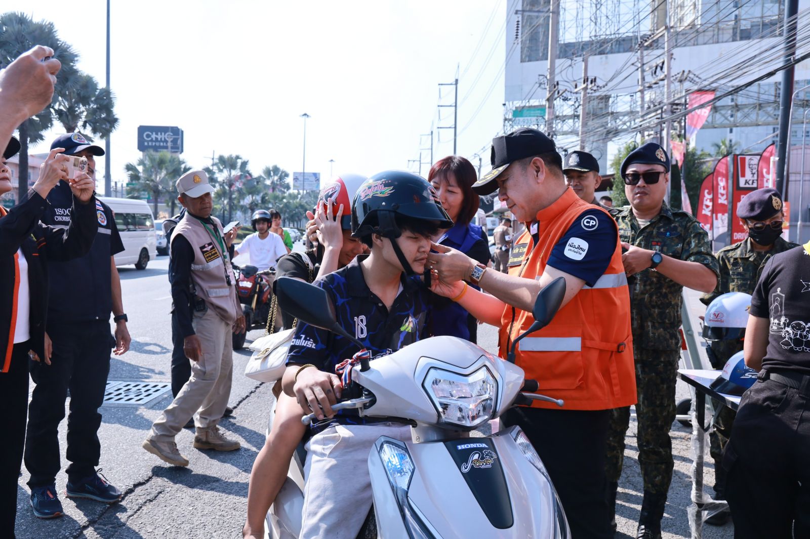 โดยคณะได้เริ่มลงพื้นที่ตรวจเยี่ยมจุดตรวจหลักของเมืองพัทยา บริเวณหน้าห้างสรรพสินค้าบิ๊กซี พัทยาใต้ พร้อมแจกหมวกกันน็อค ให้กับประชาชนเป็นของขวัญปีใหม่ เพื่อส่งเสริมความปลอดภัยในการใช้รถใช้ถนน ลดความสูญเสียจากอุบัติเหตุ จากนั้นเดินทางไปตรวจเยี่ยมจุดตรวจและจุดบริการประชาชนทางน้ำ บริเวณท่าเรือแหลมบาลีฮาย และท่าเรือเกาะล้าน ทั้งนี้ ผู้ว่าราชการจังหวัดชลบุรี ได้ตรวจสอบความพร้อมและความเรียบร้อยของเรือโดยสารและเรือเร็วที่ใช้รับส่งประชาชนและนักท่องเที่ยว พร้อมเน้นย้ำมาตรการด้านความปลอดภัยอย่างเคร่งครัด โดยกำชับให้ผู้โดยสารสวมเสื้อชูชีพทุกคนตลอดการเดินทาง เพื่อป้องกันและลดความเสี่ยงในการเกิดอุบัติเหตุทางน้ำในช่วงเทศกาลปีใหม่