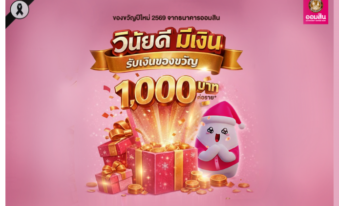 ธนาคารออมสิน ร่วมส่งมอบความสุขในช่วงเทศกาลต้อนรับปีใหม่ 2569 จัดเตรียมของขวัญ เพื่อส่งความสุขให้ประชาชน ภายใต้โครงการ “วินัยดี มีเงิน” ให้แก่ลูกค้าธนาคารด้วยการมอบเงินของขวัญพิเศษรายละ 1,000 บาท ให้แก่ลูกหนี้ที่ใช้บริการสินเชื่อวงเงินกู้ไม่เกิน 200,000 บาท มีประวัติชำระหนี้ดีติดต่อกันไม่น้อยกว่า 3 ปี ไม่เคยปรับโครงสร้างหนี้/ไม่มีประวัติการตัดหนี้สูญ และมีสถานะหนี้ปกติ (ค้างชำระไม่เกิน 30 วัน)