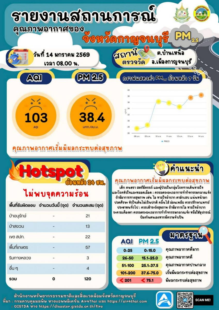 ผู้สื่อข่าวรายงานว่า ขณะเดียวกัน สำนักงานทรัพยากรธรรมชาติและสิ่งแวดล้อมจังหวัดกาญจนบุรี (ทสจ.)ได้รายงานสถานการณ์คุณภาพอากาศของจังหวัดกาญจนบุรี โดยสถานีตรวจวัด ต.บ้านเหนือ อ.เมืองกาญจนบุรี ประจำวันที่ 14 ม.ค.2569 พบปริมาณฝุ่นละอองขนาดเล็ก PM2.5 มีค่า 38.4 ไมโครกรัม/ลูกบาศก์เมตร คุณภาพอากาศอยู่ในเกณฑ์เริ่มมีผลกระทบต่อสุขภาพของประชาชน