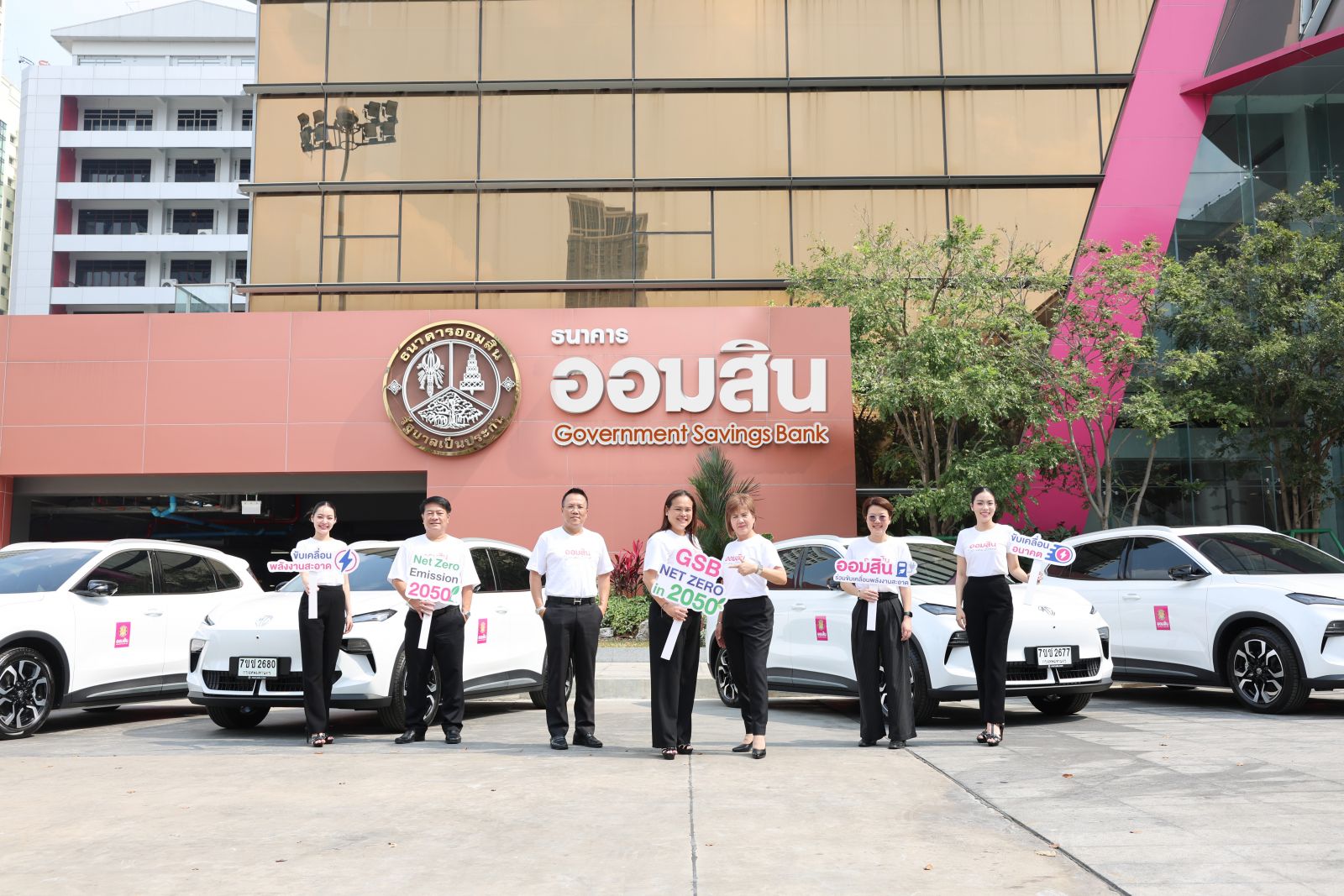 นางสาววชิรา การสุทธิ์ รองผู้อำนวยการธนาคารออมสิน กลุ่มการตลาดเพื่อความยั่งยืน และนางญดาภรณ์ ศรีพัฒน์ รองผู้อำนวยการธนาคารออมสิน กลุ่มปฏิบัติการ พร้อมคณะผู้บริหาร รับมอบรถยนต์ไฟฟ้าล็อตใหม่สำหรับใช้ในภารกิจของธนาคารออมสิน สำนักงานใหญ่ กรุงเทพฯ ตามแผนการดำเนินงานเพื่อมุ่งสู่เป้าหมายการปล่อยก๊าซเรือนกระจกสุทธิเป็นศูนย์ หรือ GSB Net Zero Roadmap ภายในปี 2050 ซึ่งภายใต้แผนดังกล่าวธนาคารตั้งเป้าหมายการเปลี่ยนมาใช้รถยนต์ไฟฟ้า ทดแทนการใช้รถเครื่องยนต์สันดาปในการปฏิบัติงานให้ครบทั้งที่สำนักงานใหญ่ และในภารกิจของสายงานกิจการสาขาทุกภูมิภาคทั่วประเทศ ภายในปี 2030 ทั้งนี้ ธนาคารได้ประกาศแผนการดำเนินงาน GSB Net Zero Roadmap ขึ้นเป็นครั้งแรกในปี 2566