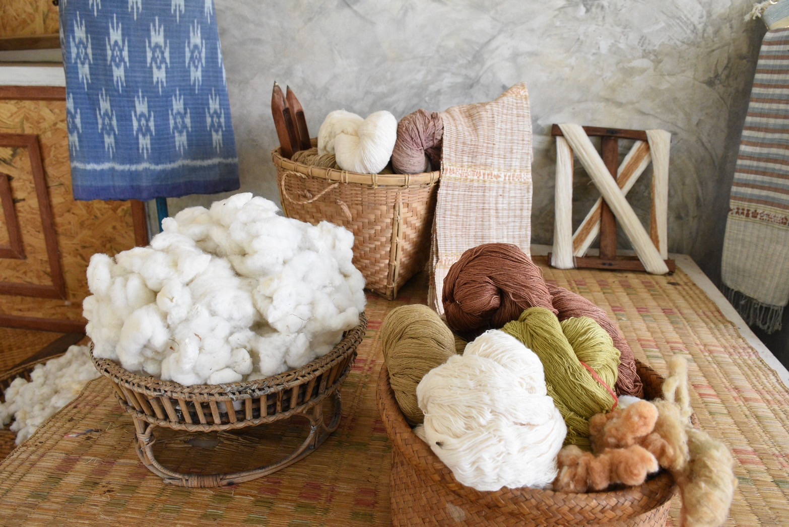 แหล่งที่มาของฝ้าย กลุ่มจะปลูกฝ้ายเองริมแม่น้ำโขง ซึ่งเป็นที่มาของชื่อ "ฝ้ายชายโขง" ที่ใช้ในบรรจุภัณฑ์ของผลิตภัณฑ์ ฝ้ายที่ปลูกเป็นพันธุ์พื้นบ้านโบราณ ไม่มีการรดน้ำ ใส่ปุ๋ย หรือใช้สารเคมีใด ๆ การปลูกจะทำเมื่อน้ำในแม่น้ำโขงลดลง ในการเก็บเกี่ยว การเก็บดอกฝ้ายในช่วงเดือนมีนาคม - เมษายน (ประมาณ 3-4 เดือนหลังปลูก) ต้องเก็บในช่วงที่ไม่มีฝนตก เพราะความชื้นจะทำให้ดอกฝ้ายเน่า การทำความสะอาดดอกฝ้ายที่เก็บเกี่ยวมา โดยการแยกสิ่งสกปรก เช่น เศษไม้ เศษหญ้า หรือใบฝ้ายออก จากนั้น นำอิ้วฝ้าย(ปั่นฝ้าย) นำฝ้ายไปอิ้ว (กระบวนการแยกเมล็ดออกจากเส้นใย) โดยใช้เครื่องมือโบราณที่หายากในปัจจุบัน เมื่ออิ้วฝ้ายเสร็จแล้วจะดีดฝ้าย นำฝ้ายที่อิ้วแล้วไปดีดให้เป็นปุยล้อฝ้ายและเข็นด้าย นำฝ้ายที่ดีดแล้วมาล้อ และเข็นเป็นเส้นด้ายบนเหล็กไนหรือหลา สมาชิกในกลุ่มจะรับผิดชอบการเข็นด้ายและนำมาขายให้กับกลุ่ม ซึ่งกลุ่มจะซื้อเส้นด้ายฝ้ายขาวจากสมาชิกในราคา 300 บาท/กิโลกรัม การเตรียมเส้นด้ายก่อนย้อม เส้นด้ายฝ้ายที่เข็นแล้วจะถูกนำไปแช่น้ำค้างคืนเพื่อให้เป็นสีขาว การย้อมสีธรรมชาติ มีเอกลักษณ์สำคัญ กลุ่มย้อมสีผ้าด้วย สีธรรมชาติ 100% เท่านั้น โดยไม่มีการใช้สารเคมีหรือสีสังเคราะห์ผสมเด็ดขาด