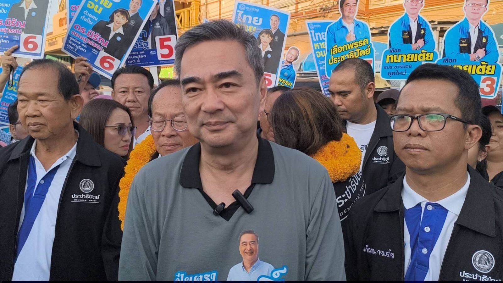 อภิสิทธิ์ เวชชาชีวะ หน.พรรคประชาธิปัตย์ สวมเสื้อปุ๋ยสูตร 27-27-27 ใช้แล้วประเทศไทยโตไว เดินสายขอคะแนนเสียงจากแม่ค้าพ่อค้าตลาดสดตลาดสดหน้าสถานีรถไฟจังหวัดพิษณุโลก