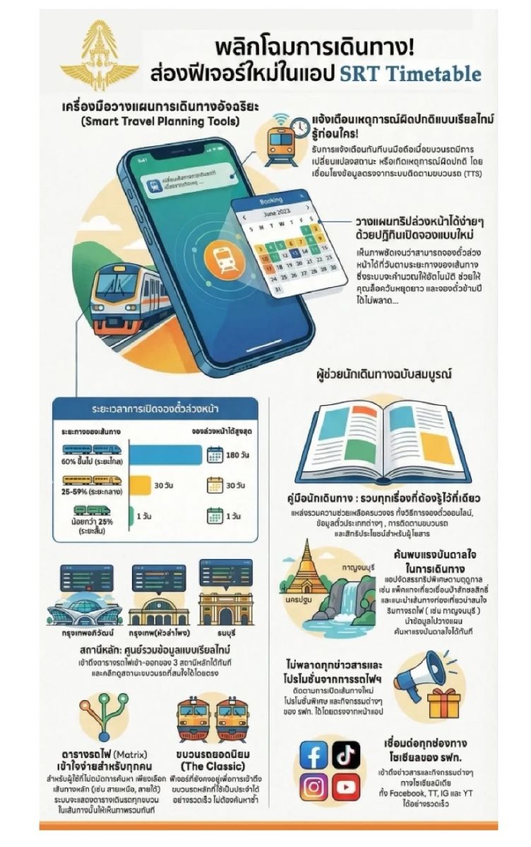 พลิกโฉมการเดินทาง! รฟท. อัปเดตแอปพลิเคชัน SRT Timetable V.3 มาพร้อมฟังก์ชั่นใหม่ ทันสมัย เข้าใจง่าย เพื่อให้คุณไม่พลาดทุกความเคลื่อนไหว