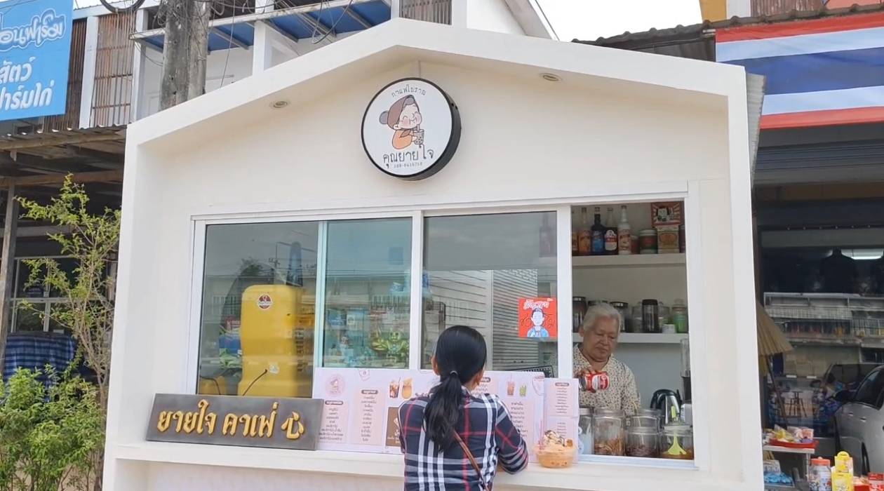 ที่หน้าอาคารพาณิชย์ ริมถนนสุวรรณศร สาย 33 ขวามือฝั่งขาขึ้นสี่แยกสามทหาร อ.กบินทร์บุรี จ.ปราจีนบุรี จะมีตู้กาแฟสีขาวตั้งอยู่ ที่แปลกใจซึ่งส่วนใหญ่เรามักจะเห็นคนขายหนุ่มๆสาวๆแต่ที่นี่กลับมีหญิงสูงวัยที่เป็นทั้งเจ้าของและคนชงคนขายและเป็นที่มาชื่อร้าน ยายใจคาเฟ่ และคนที่จะชงกาแฟแบบโบราณหรือน้ำแข็งใสให้เราทานคือคุณยายสุดใน ผุงแสงมณีวงศ์ อายุ 74 ปี ที่ดูยังกระฉับกระเฉงหน้าตายิ้มแย่มแจ่มใส ยายใจบอกว่า ขายกาแฟน้ำแข็งใสมาตั้งแต่อายุ 18 จนถึงปัจจุบันอายุเข้า 74 รวมแล้ว 56 ปี น่าจะเป็นคนขายกาแฟที่อายุมากที่สุดคนหนึ่ง ส่วนราคาชากาแฟที่ขายเริ่มแรกยายใจบอกว่าขายแก้วละ 15 บาท จนปัจจุบันรับขึ้นขายราคา แก้วละ 30 บาท ส่วนปังเย็นน้ำแข็งใสถ้วยละ 40 บาท พิเศษตรงที่ใส่ท๊อปปิ้งให้แบบจุกๆไม่หวงไม่พอบอกได้ยายใจเติมให้ฟรี ลูกค้ามีทุกรุ่นทุกวัยมีทั้งลูกค้าที่ทานกันมายาวนานบางคนทานแต่เด็ดจนโตมีครอบครัวมีลูกก็ยังพากันมาทาน และรวยมทั้งลูกค้าขาจรที่ผ่านไปมาก็แวะอุดหนุน ทำให้ยังมีกำลังใจที่จะขายไปเรื่อยๆไม่เหนื่อยแต่มีความสุขที่ได้ขายของ ที่สำคัญยายใจบอกถ้าไม่ขายกลัวว่าลูกค้าจะไม่มีกาแฟขนมปังน้ำแข็งใสอร่อยกิน