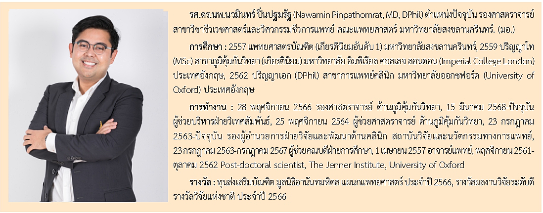 “ตอนนั้นผมก็มองว่า เอ๊ะทำไมเวลาเรารักษาคนไข้ มันมีเชื้อดื้อยา มียาไม่พอรักษา วัคซีนก็ไม่มีที่ผลิตในประเทศไทย ก็เริ่มอยากเป็นคนพัฒนายาหรือวัคซีนเอง ก็เลยคุยกับอาจารย์ คุยกับคณบดีว่า เป็นไปได้ไหม ที่จะส่งเราไปเรียนปริญญาเอกที่ต่างประเทศด้านภูมิคุ้มกัน ด้านวัคซีน ซึ่งก็ได้รับการสนับสนุนเป็นอย่างดีจากคณะแพทยศาสตร์ในการส่งไปศึกษาต่อที่ต่างประเทศ”