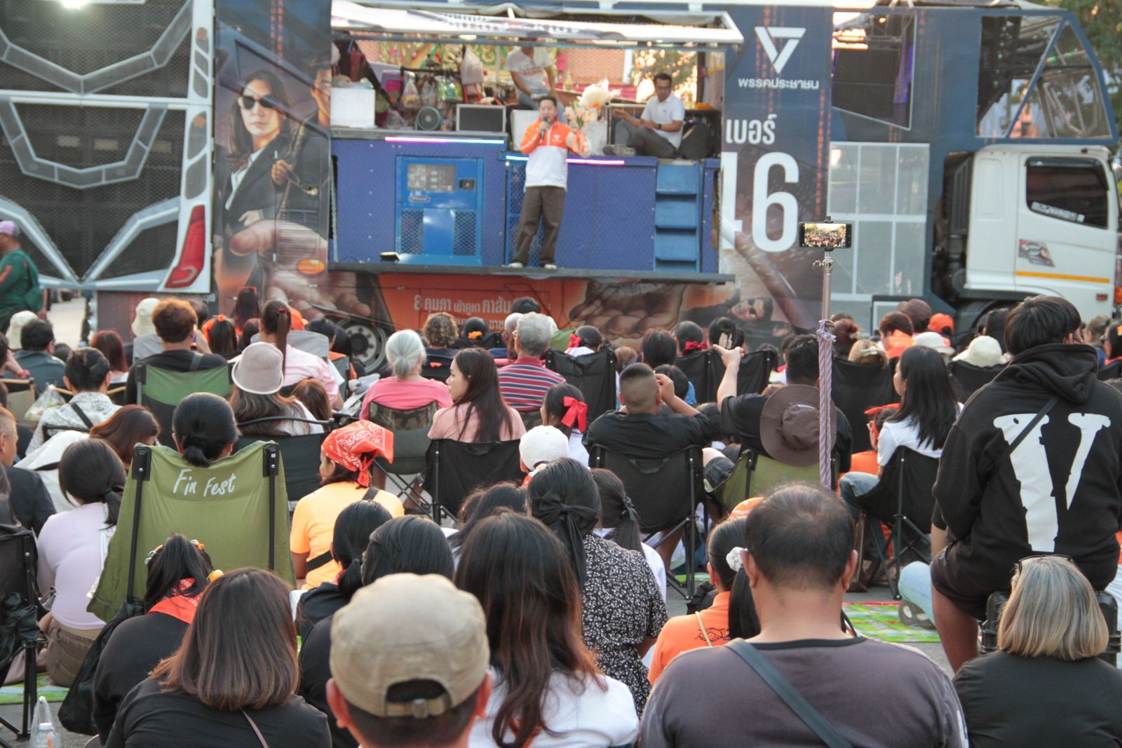 โดยไฮไลท์อยู่ที่การขึ้นเวทีปราศรัยของช่อ พรรณิการ์ ที่ได้มีการพูดถึงสนามเลือกตั้งของจังหวัดกาญจนบุรี ซึ่งในช่วงที่ผ่านมา มีกรณีคลิปเสียงหลุด ที่หลายคนเรียกกันว่าคลิปเสียงหลุดประกาศศักดา ที่เจ้าของเสียงในคลิป ได้มีการพูดจา แสดงความมั่นใจ ว่าพรรคของตัวเองจะเป็นแกนนำจัดตั้งรัฐบาลได้แน่นอน อีกทั้งยังบอกว่า หากพักส้ม ได้เป็นแกนนำจัดตั้งรัฐบาลทหารก็จะออกมาปฏิวัติทำให้ประเทศชาติเกิดความไม่สงบ โดยช่อ พรรณิการ์ ได้กล่าวว่า วันนี้ กองทัพบกได้ออกมาประกาศชัดเจนแล้วว่ากองทัพไม่ยุ่งเกี่ยวกับการเมือง การที่เจ้าของเสียงในคลิปออกมาพูดเช่นนี้อาจทำให้เกิดความเข้าใจผิดในหมู่ประชาชนได้ นอกจากนี้ ช่อ พรรณิการ์ ยังได้ฝากไปถึงเจ้าของเสียงในคลิปประกาศศักดาดังกล่าว ที่แสดงความมั่นใจ และวางอำนาจบาตรใหญ่ว่าจะสามารถจัดตั้งรัฐบาลได้จะมีการโยกย้ายข้าราชการตามอำเภอใจ ว่า ก่อนจะประกาศแสดงความมั่นใจว่าจะจัดตั้งรัฐบาลได้ขอให้เจ้าของเสียงในคลิปดังกล่าวชนะการเลือกตั้งและเป็นส.สให้ได้ก่อน พร้อมกันนี้ ได้ฝากถึงพี่น้องประชาชนชาวจังหวัดกาญจนบุรีรวมถึงประชาชนผู้มีสิทธิ์เลือกตั้งทั่วประเทศให้ช่วยกันเลือกพรรคประชาชนทั้ง 2 ใบ รวมถึงร่วมลงประชามติแก้ไขรัฐธรรมนูญ เพื่อร่วมกันเปลี่ยนแปลงประเทศไทยให้ดีขึ้นกว่าที่เป็นอยู่
