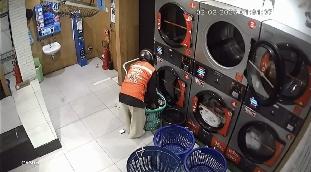 เหตุการณ์ดังกล่าวเกิดขึ้นเมื่อเวลา 01.31 น. วันที่ 2 กุมภาพันธ์ 2569 โดยผู้เสียหายมีหลักฐานเป็นภาพจากกล้องวงจรปิด ซึ่งสามารถบันทึกพฤติกรรมของคนร้ายไว้ได้อย่างชัดเจน จากการตรวจสอบภาพ พบคนร้ายเป็นชายไทย สวมเสื้อวินจักรยานยนต์สีส้ม ด้านหลังสกรีนข้อความ “โทนี่ผับ พัทยาใต้” สวมกางเกงขายาว รองเท้าผ้าใบ สะพายกระเป๋าสีน้ำตาล และสวมหมวกกันน็อกเต็มใบสีดำคาดขาว ทำทีถือตะกร้าผ้าเดินเข้ามาภายในร้านเหมือนลูกค้าทั่วไป ก่อนจะมุ่งตรงไปยังเครื่องอบผ้าแห้งที่ผู้เสียหายใช้งานอยู่