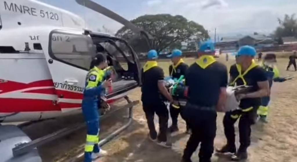 ร่วมกันลำเลียงผู้ป่วยขึ้นเฮลิคอปเตอร์อย่างเป็นระบบและปลอดภัย ขณะที่ปลายทางมีทีมแพทย์และรถฉุกเฉินของ โรงพยาบาลลำปาง เตรียมพร้อมรับช่วงการรักษาต่ออย่างทันท่วงที