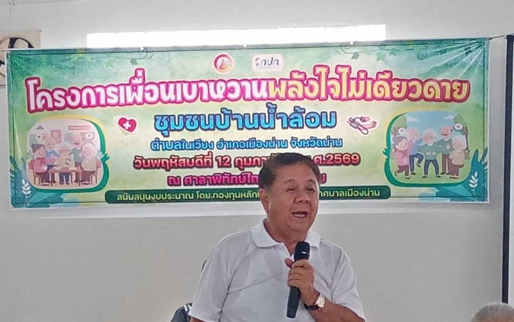 (น่าน) — วันที่ 12 กุมภาพันธ์ 2569 เวลา 09.00 น. ณ ชุมชนบ้านน้ำล้อม ตำบลในเวียง อำเภอเมืองน่าน จังหวัดน่าน นายสุรพล เธียรสูตร นายกเทศมนตรีเมืองน่าน ลงพื้นที่พบปะและให้กำลังใจผู้เข้าร่วมโครงการ “เพื่อนเบาหวานพลังใจไม่เดียวดาย” ซึ่งได้รับการสนับสนุนงบประมาณจากกองทุนหลักประกันสุขภาพ เทศบาลเมืองน่าน