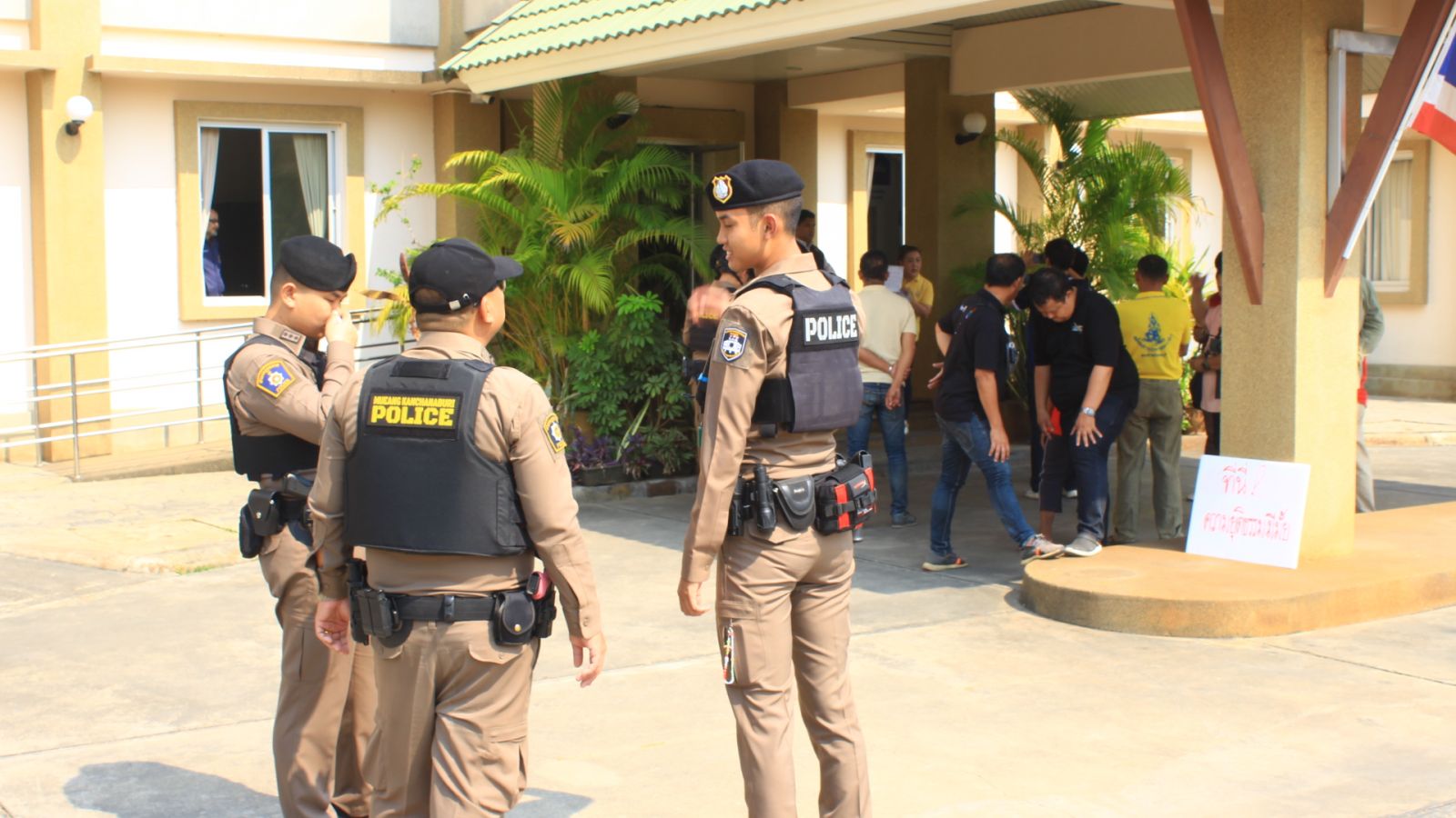 ต่อมา ร้อยตำรวจเอก พงศ์บัณฑิต ปิ่นสุวรรณ ผอ. กกต.กาญจนบุรี จึงได้มอบหมายหน้าที่ให้นายกูลกวิน โหมาศวิน ซึ่งเป็นผู้ดูแลงานในตำแหน่งหัวหน้ากลุ่มงานสืบสวนสอบสวนและพรรคการเมือง ของสำนักงานคณะกรรมการการเลือกตั้งประจำจังหวัดกาญจนบุรี ลงไปชี้แจงแก่คณะของ นายวัฒนา เชียงทอง อดีตนายกเทศบาลหนองขาว ที่เดินทางเข้าไปทวงถามเรื่องการร้องเรียน และขณะเจรจา ได้มีเจ้าหน้าที่ตำรวจชุดสายตรวจ สภ.เมืองกาญจน์เกือบ 10 นาย เดินทางเข้าไปเพื่อดูแลความเรียบร้อยภายในสำนักงานการเลือกตั้งประจำจังหวัดกาญจนบุรี