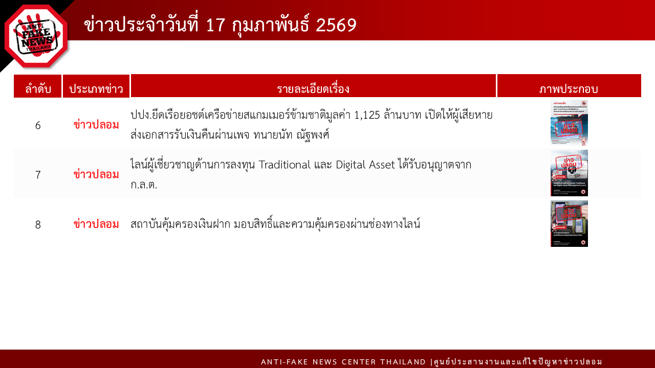 ทั้งนี้ในวันที่ 17 กุมภาพันธ์ 2569 AFNC ได้ตรวจสอบพบข้อความทั้งหมด 164,553 ข้อความ โดยมีข้อความที่ต้องดำเนินการตรวจสอบ (Verify) ทั้งสิ้น 16,694 ข้อความ สำหรับช่องทางที่มีการพบเบาะแสมากที่สุด คือ ข้อความที่มาจาก Social Listening 16,689 ข้อความ ตามมาด้วยช่องทาง Line Official 5 ข้อความ โดยเป็นเรื่องที่ต้องดำเนินการตรวจสอบทั้งหมด 39 เรื่อง ได้รับผลการตรวจสอบจากหน่วยงานที่เกี่ยวข้องแล้ว 9 เรื่องในจำนวนนี้เป็นข่าวที่ได้รับความสนใจจากประชาชนมากที่สุด 8 เรื่อง ซึ่งเป็นข่าวจริง 1 เรื่อง ข่าวปลอม 7 เรื่อง ได้แก่