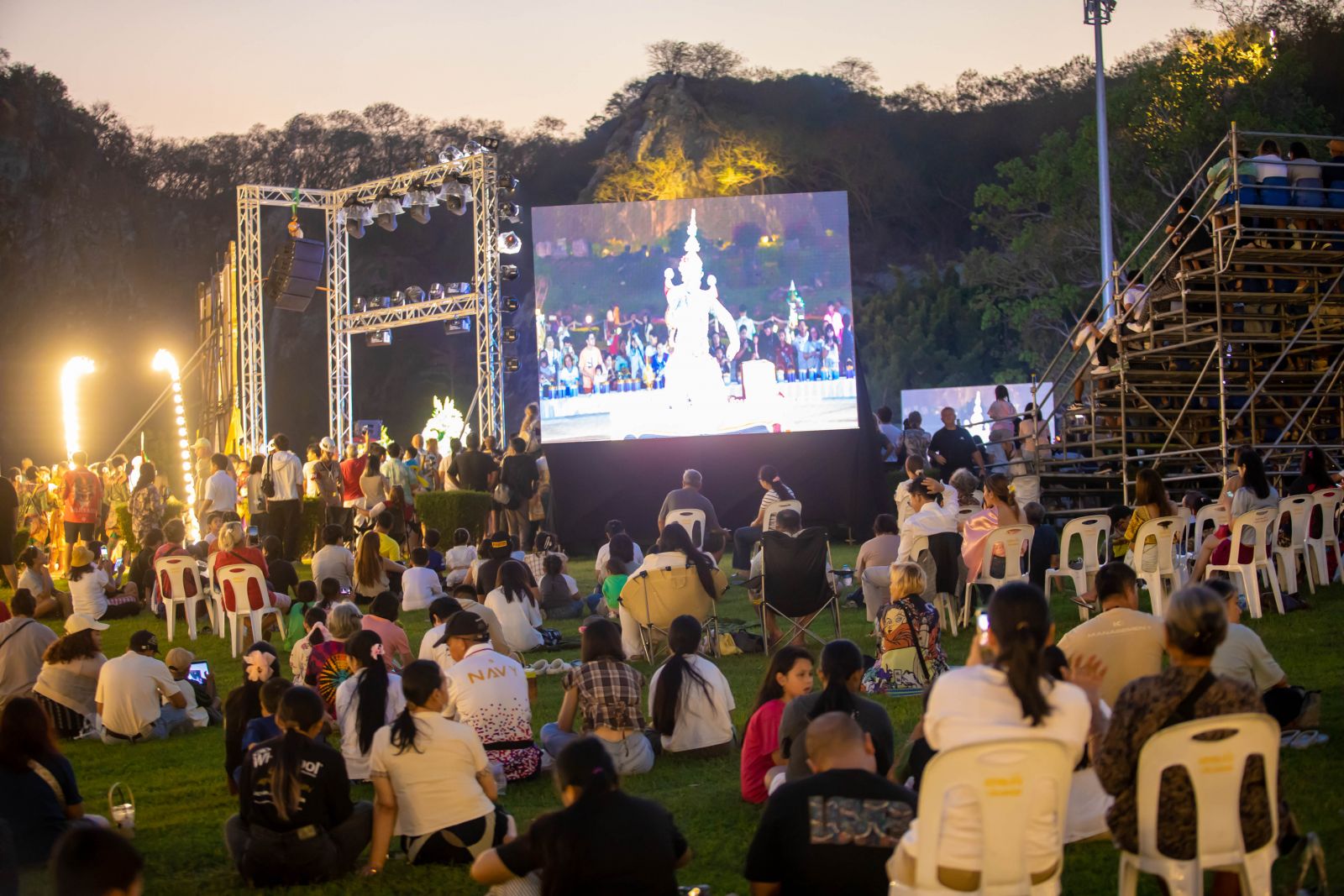 บรรยากาศโดยรอบพื้นที่จัดงานเต็มไปด้วยสีสันของประชาชนจำนวนมากที่ร่วมแต่งกายชุดไทยประยุกต์ บางคนห่มสไบจับคู่กางเกงยีนส์ สร้างภาพร่วมสมัยที่กลมกลืนกับบรรยากาศวัฒนธรรมไทย แม้ภายในพื้นที่การแสดงจะมีผู้เข้าชมเต็มความจุ แต่ประชาชนจำนวนไม่น้อยยังคงปักหลักรับชมด้านนอก โดยนำเก้าอี้สนามและเสื่อมาปูนั่งชมผ่านจอถ่ายทอดสดที่จัดเตรียมไว้ สะท้อนถึงความสนใจและศรัทธาที่มีต่อการแสดงศิลปวัฒนธรรมไทย